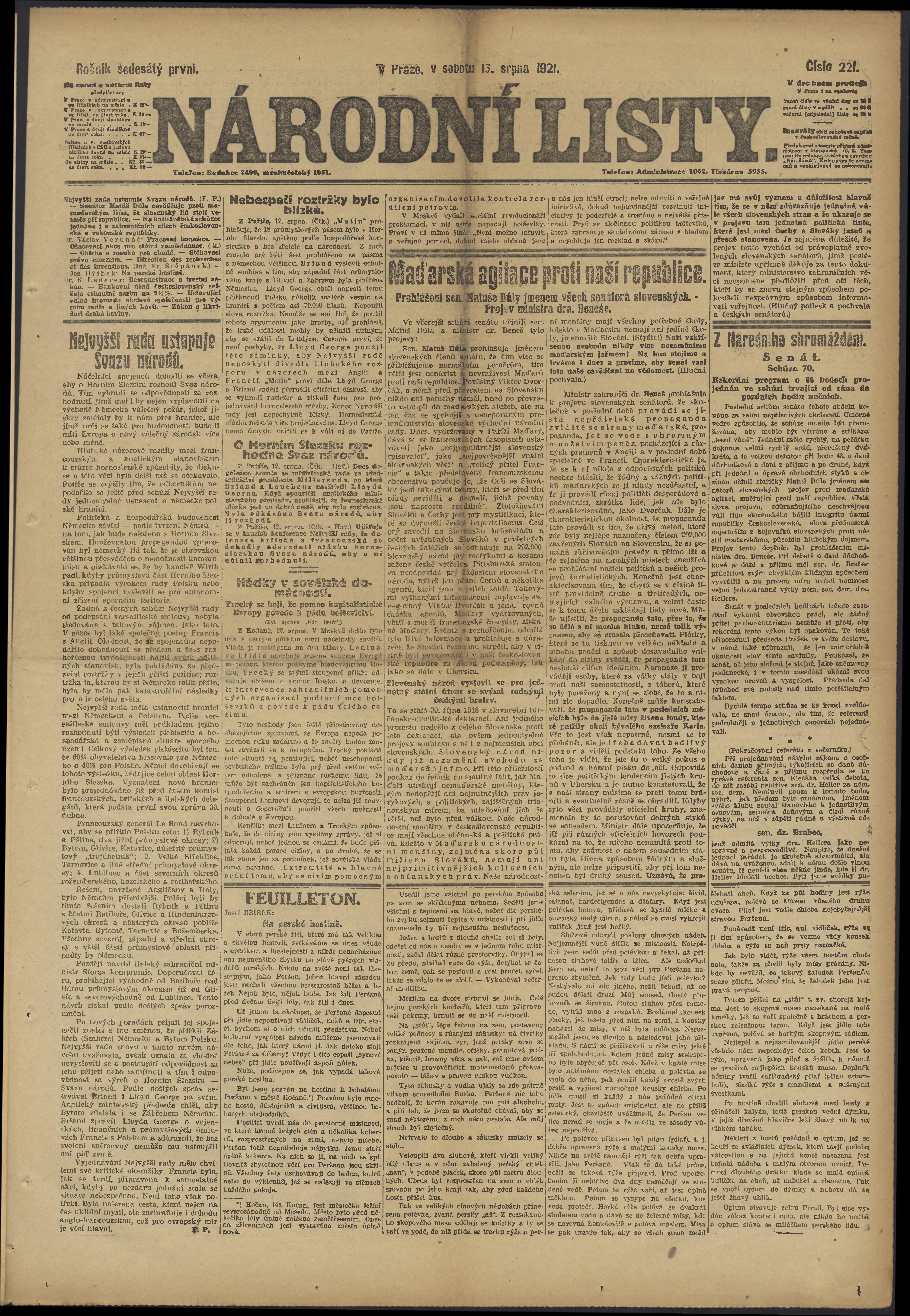* Datum vydání výtisku: 13.8.1921 Číslo výtisku: 221 Poznámky k výtisku: ranní vydání;