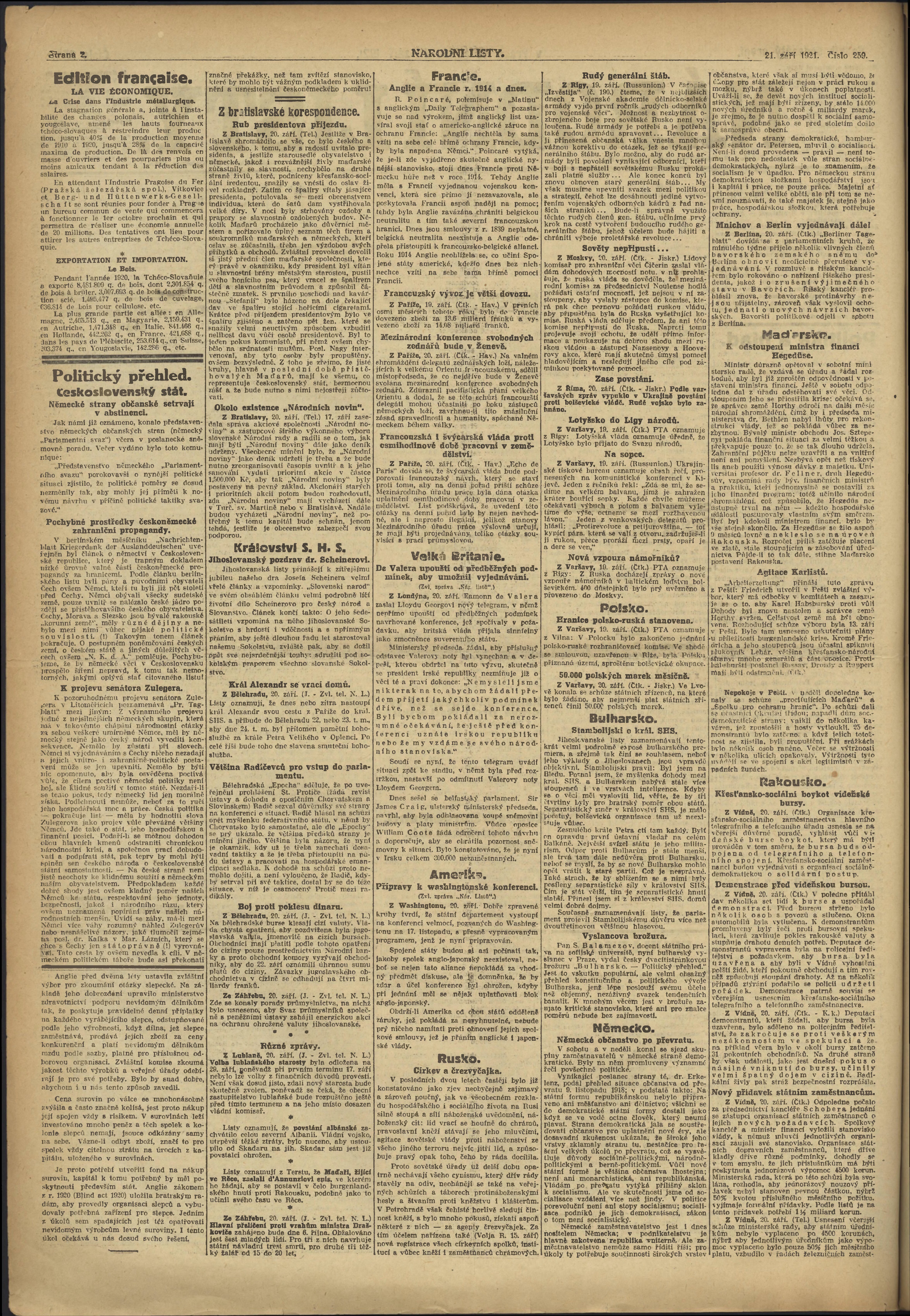 * Datum vydání výtisku: 21.9.1921 Číslo výtisku: 259 Poznámky k výtisku: ranní vydání;