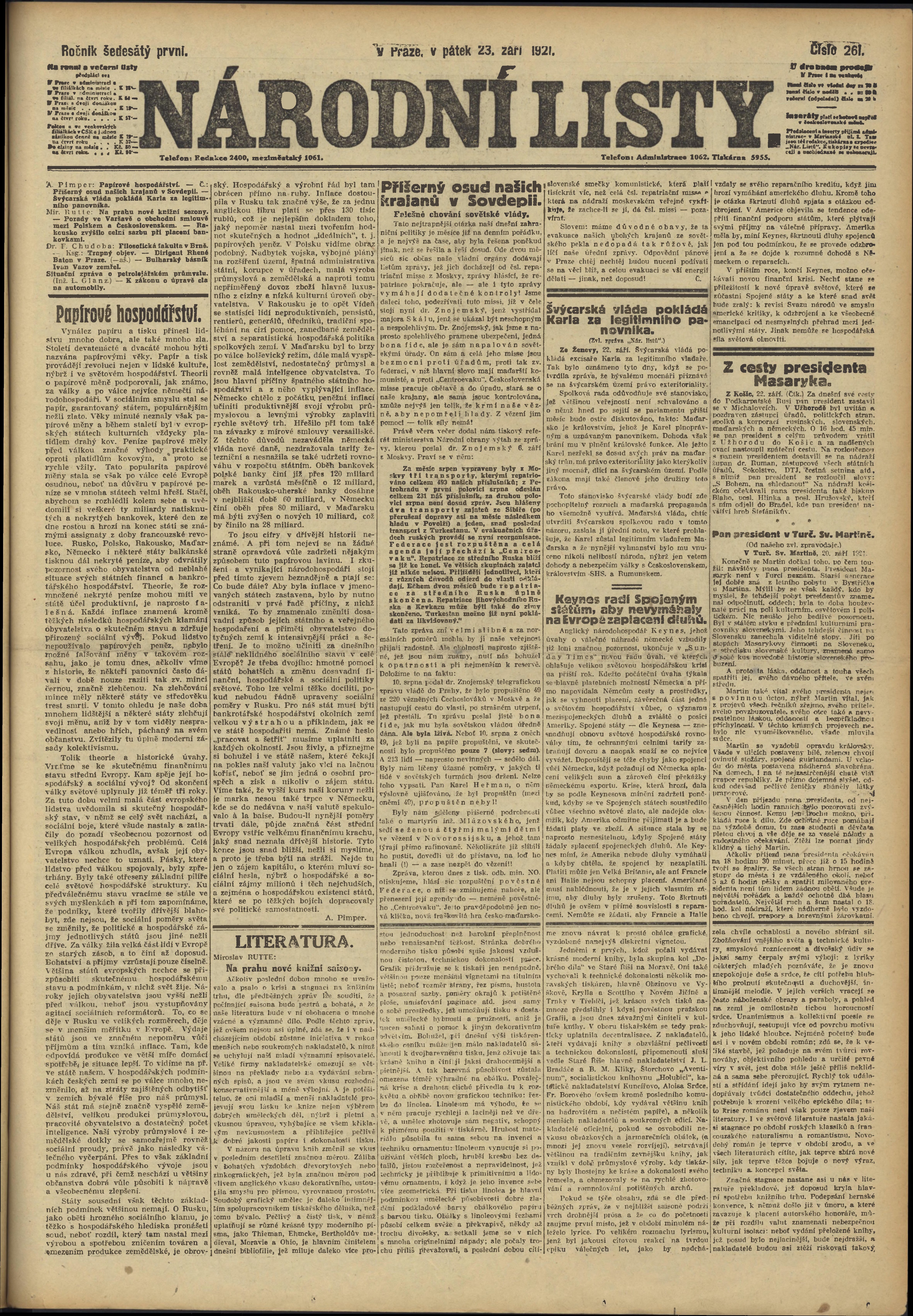 * Datum vydání výtisku: 23.9.1921 Číslo výtisku: 261 Poznámky k výtisku: ranní vydání;