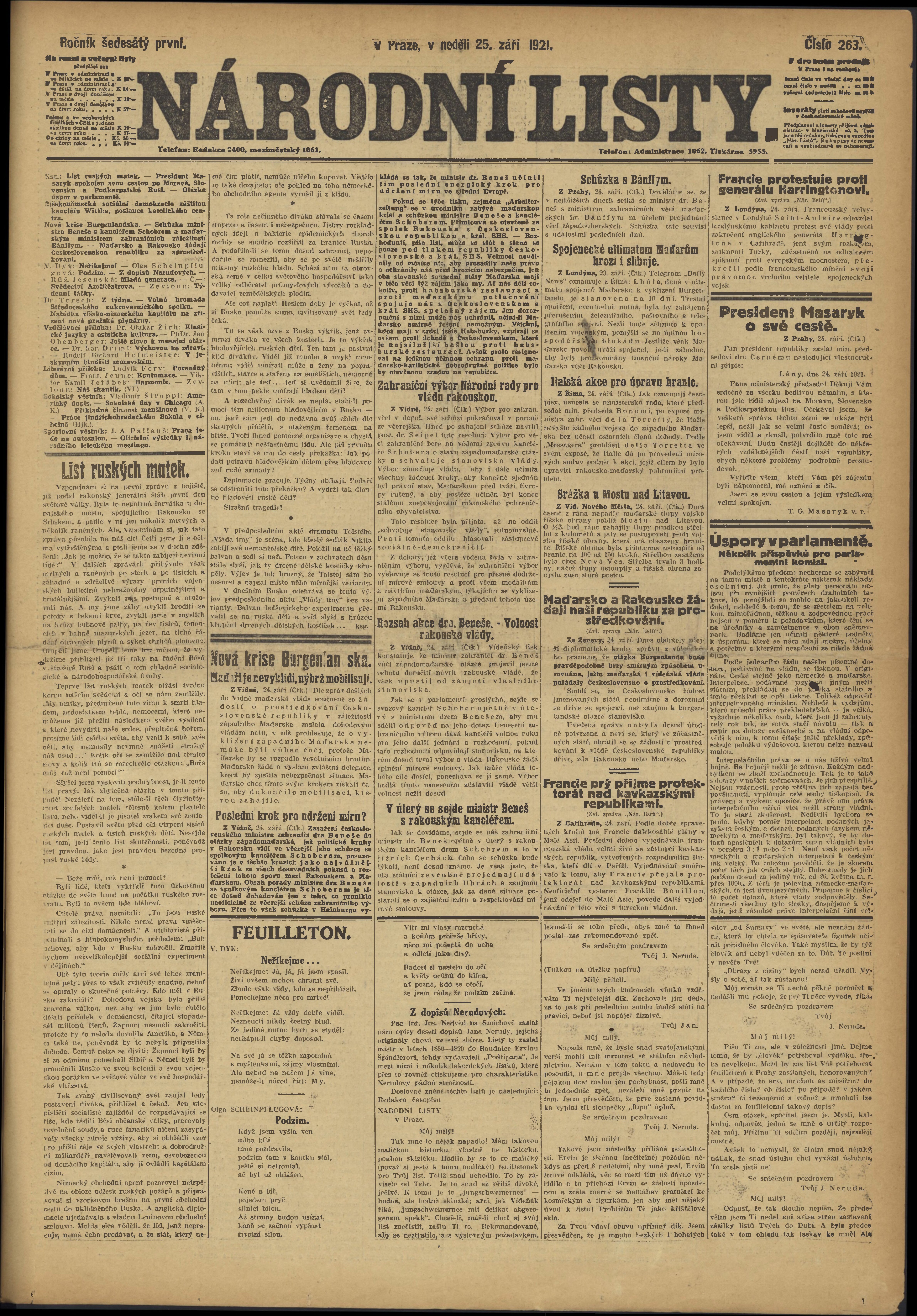 * Datum vydání výtisku: 25.9.1921 Číslo výtisku: 263 Poznámky k výtisku: ranní vydání;