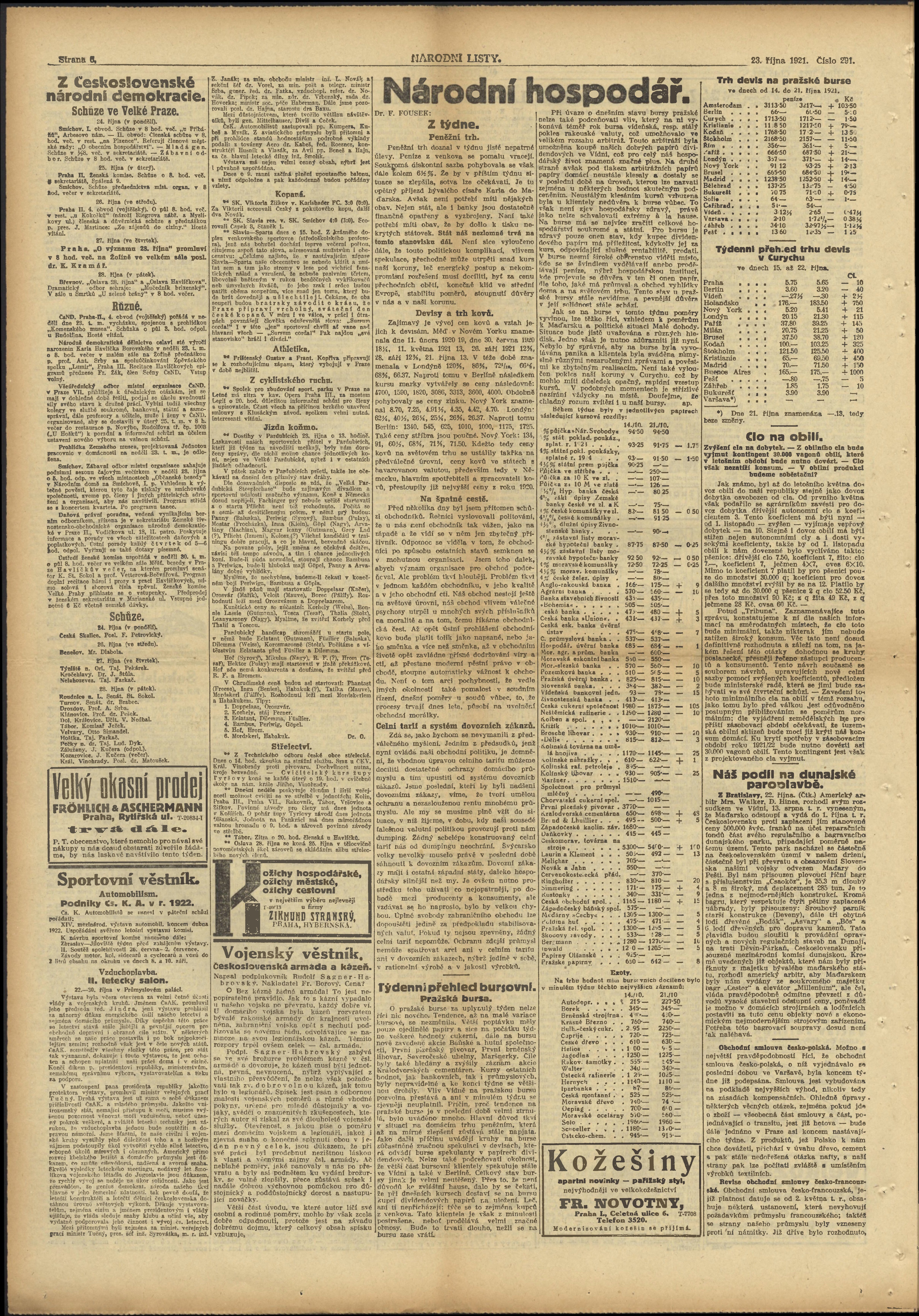 * Datum vydání výtisku: 23.10.1921 Číslo výtisku: 291 Poznámky k výtisku: ranní vydání;