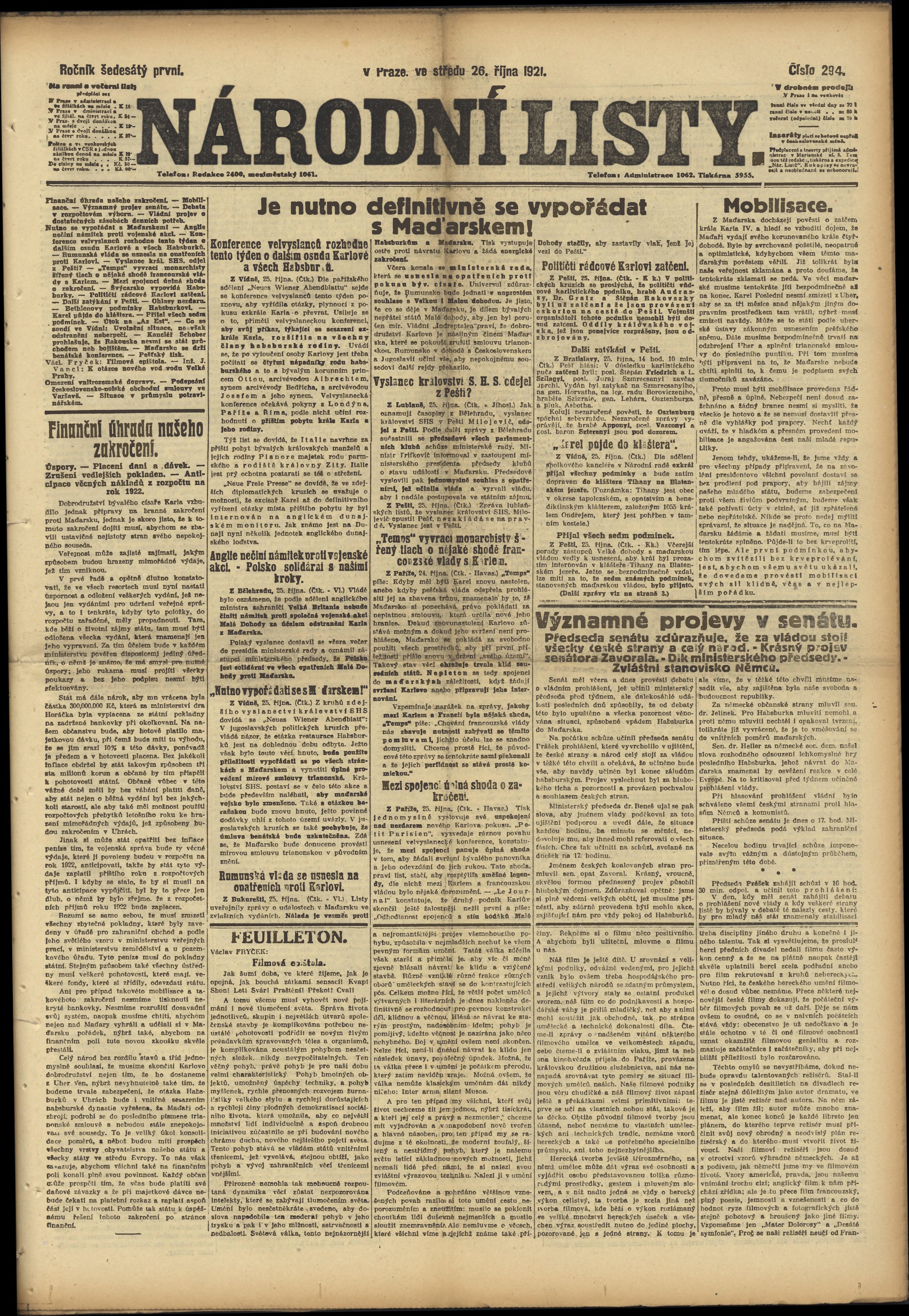 * Datum vydání výtisku: 26.10.1921 Číslo výtisku: 294 Poznámky k výtisku: ranní vydání;