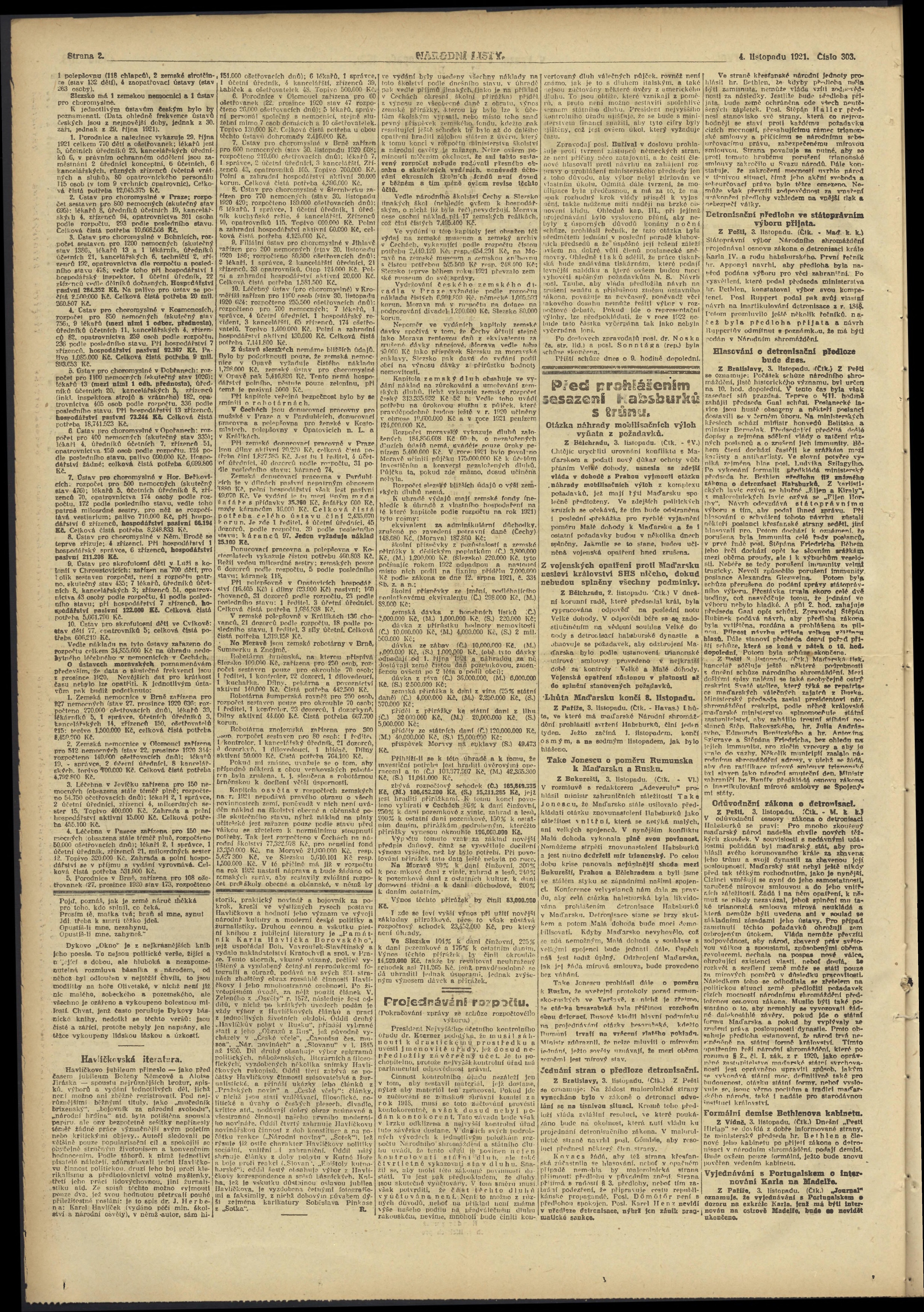 * Datum vydání výtisku: 4.11.1921 Číslo výtisku: 303 Poznámky k výtisku: ranní vydání;
