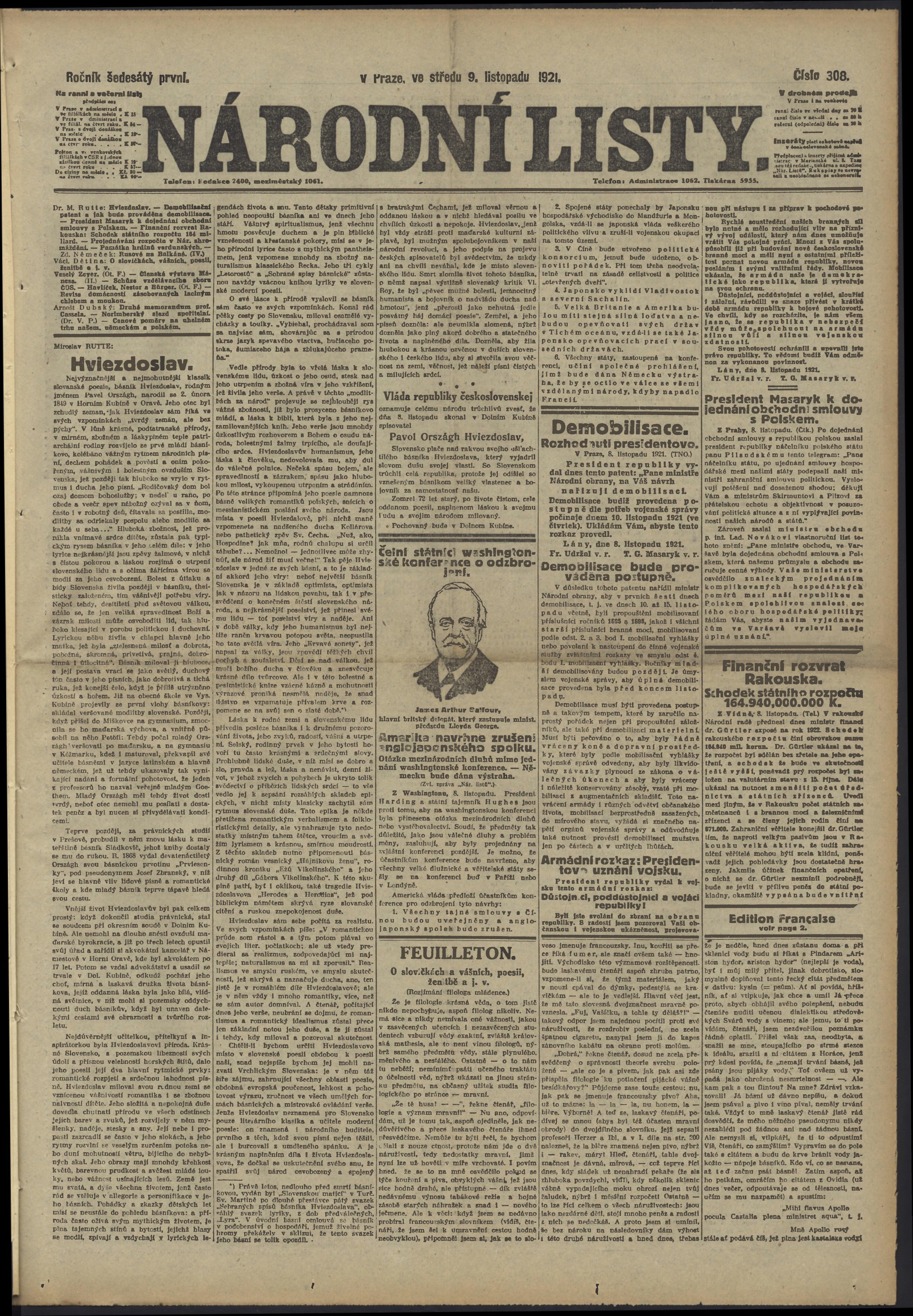 * Datum vydání výtisku: 9.11.1921 Číslo výtisku: 308 Poznámky k výtisku: ranní vydání;