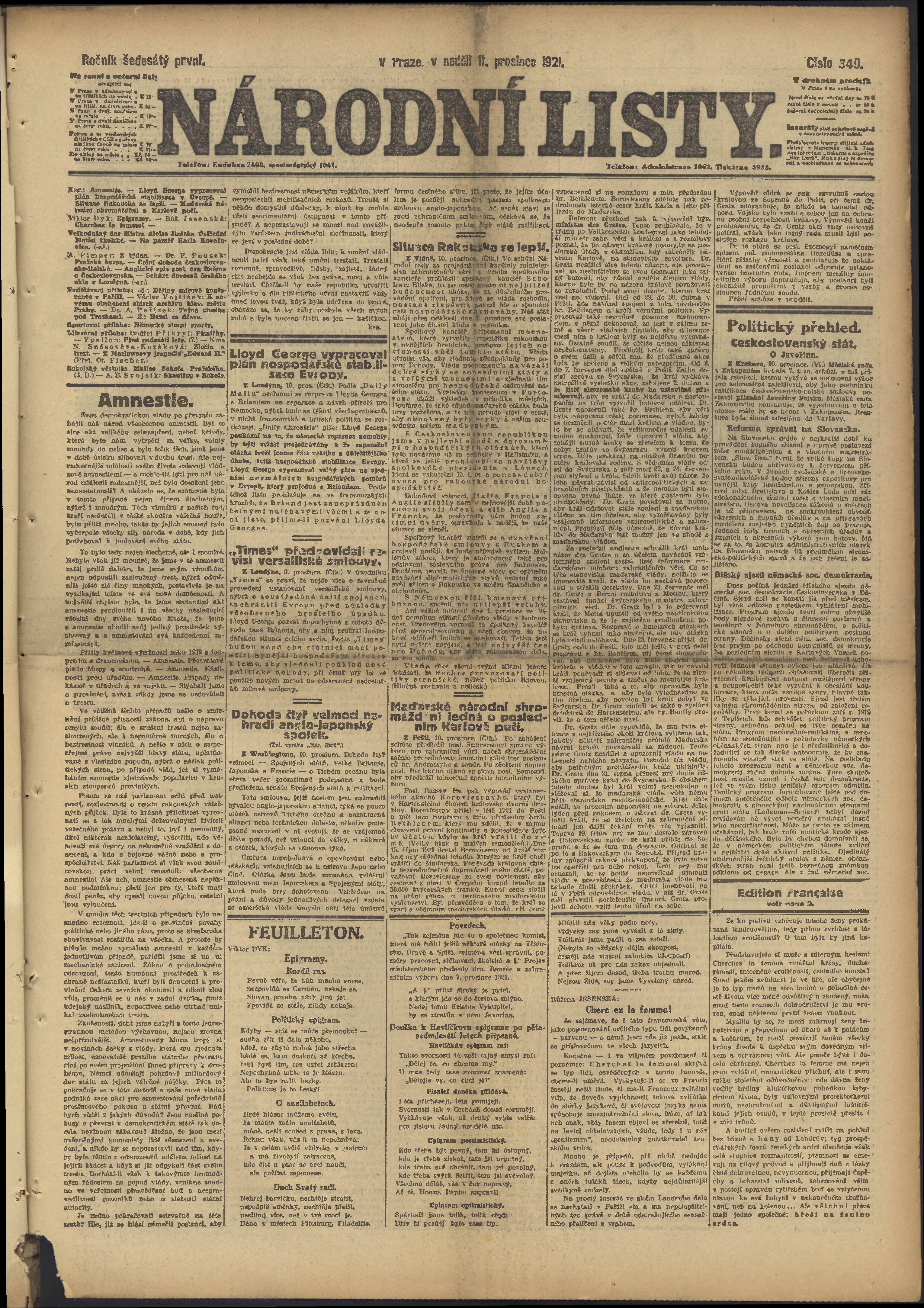 * Datum vydání výtisku: 11.12.1921 Číslo výtisku: 340 Poznámky k výtisku: ranní vydání;
