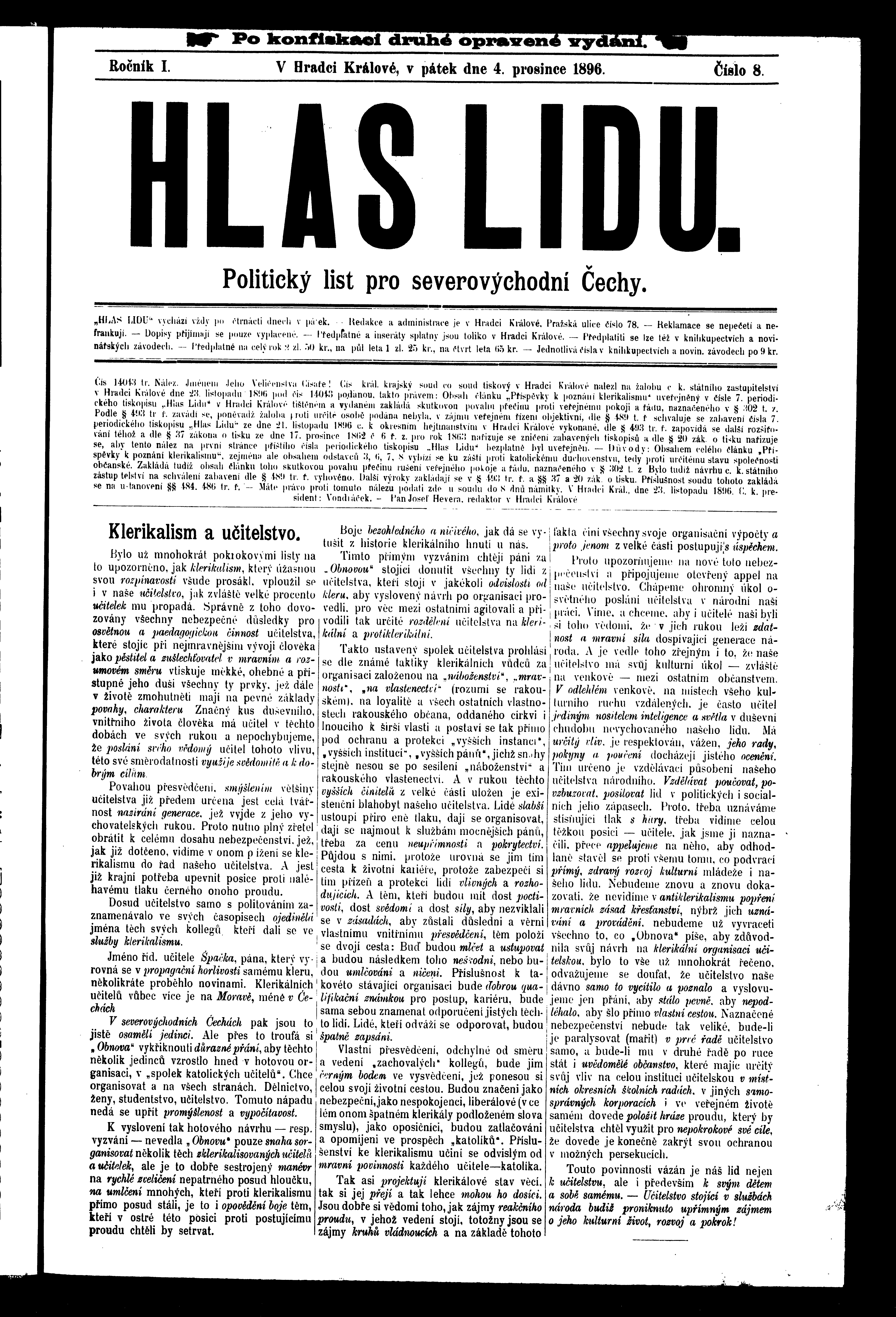 * Datum vydání výtisku: 4.12.1896 Číslo výtisku: 8 Poznámky k výtisku: ranní vydání