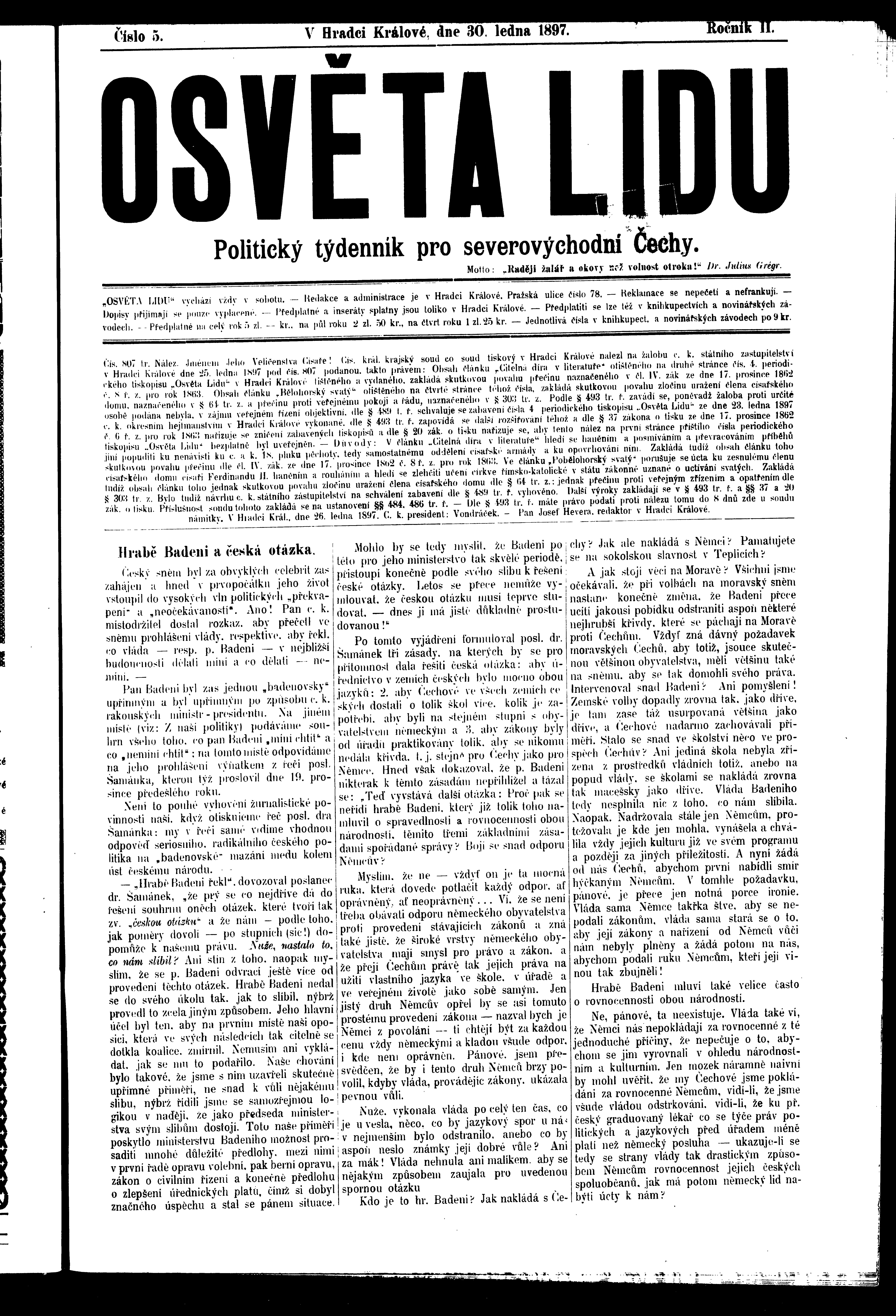 * Datum vydání výtisku: 30.1.1897 Číslo výtisku: 5 Poznámky k výtisku: ranní vydání
