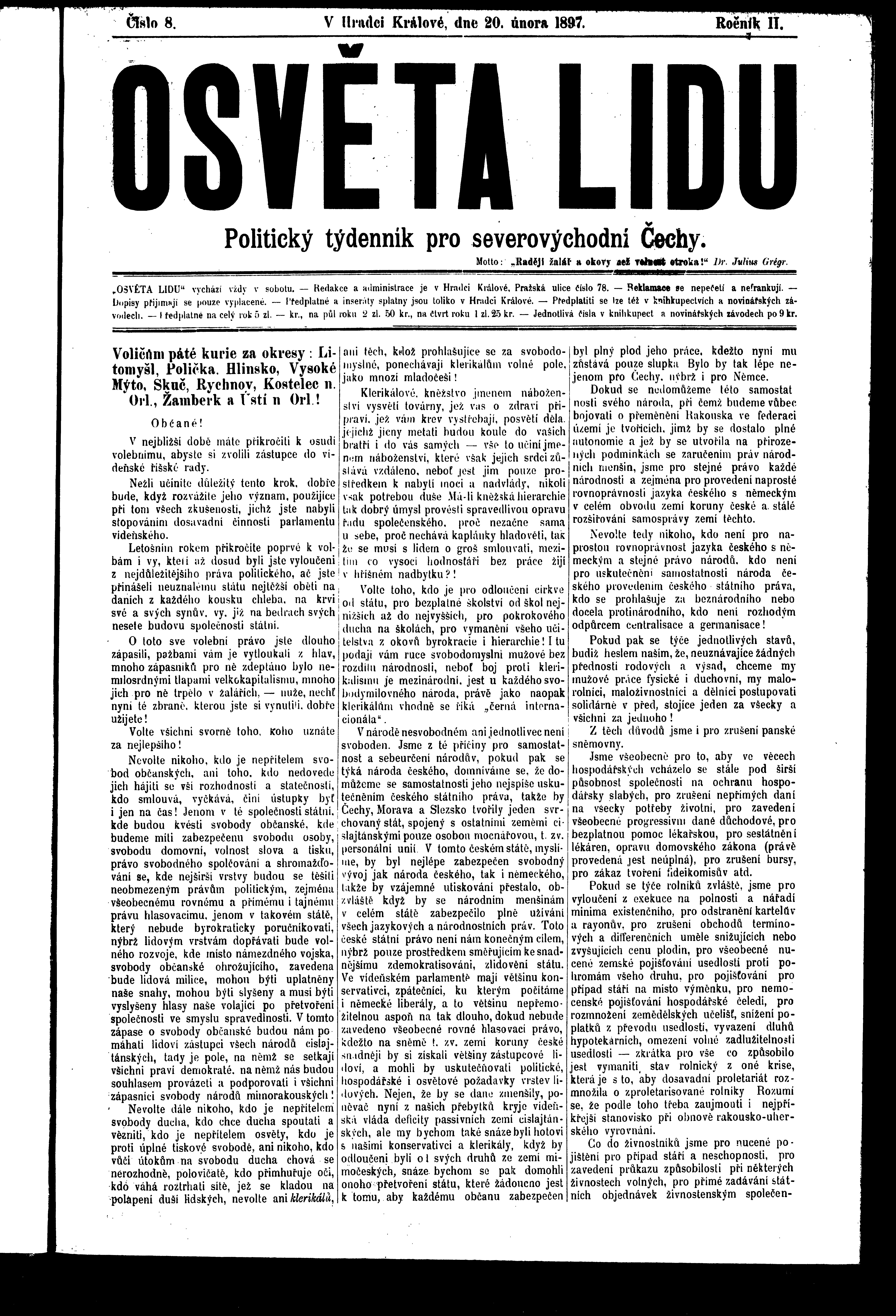 * Datum vydání výtisku: 20.2.1897 Číslo výtisku: 8 Poznámky k výtisku: ranní vydání