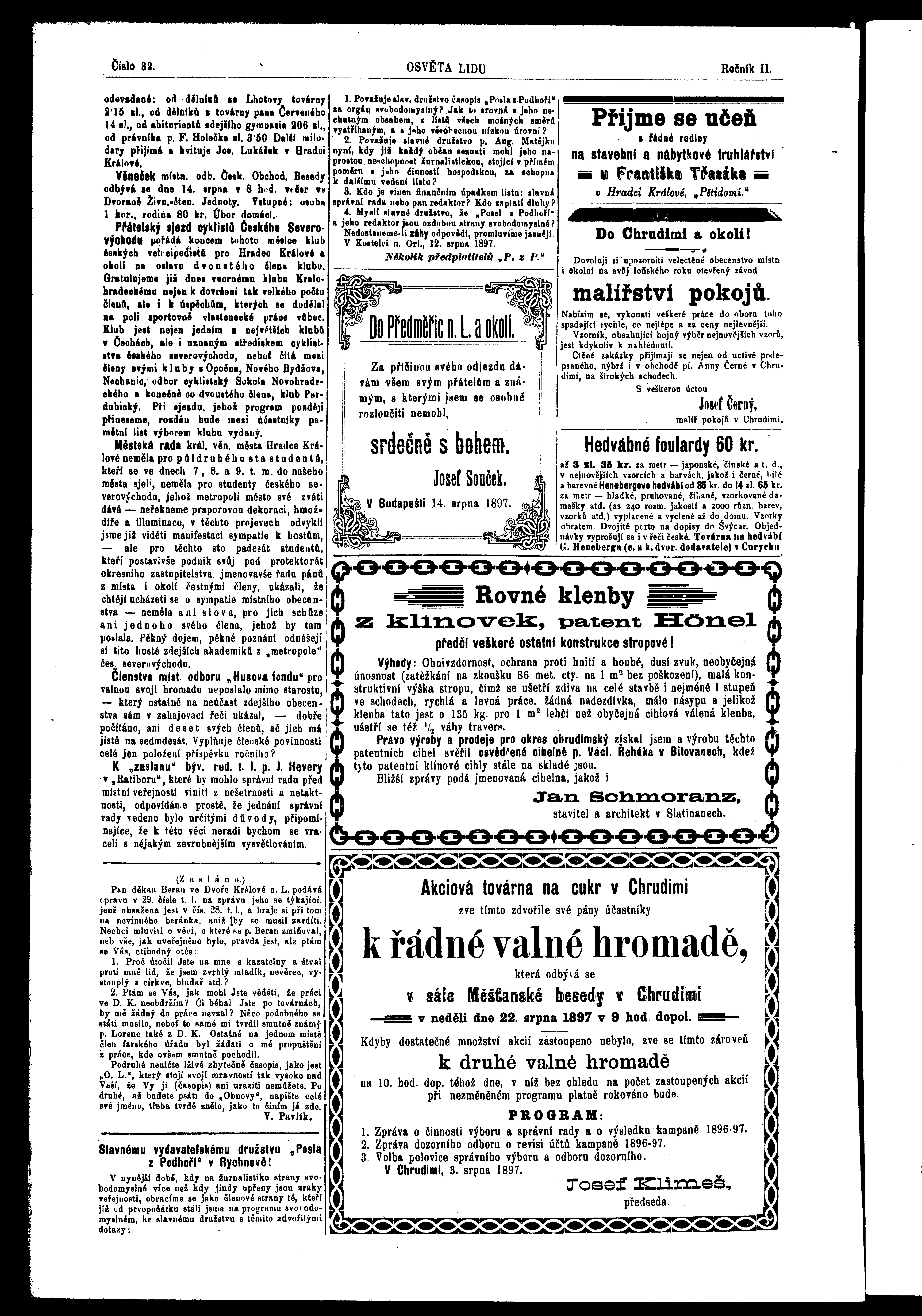 * Datum vydání výtisku: 14.8.1897 Číslo výtisku: 32 Poznámky k výtisku: ranní vydání
