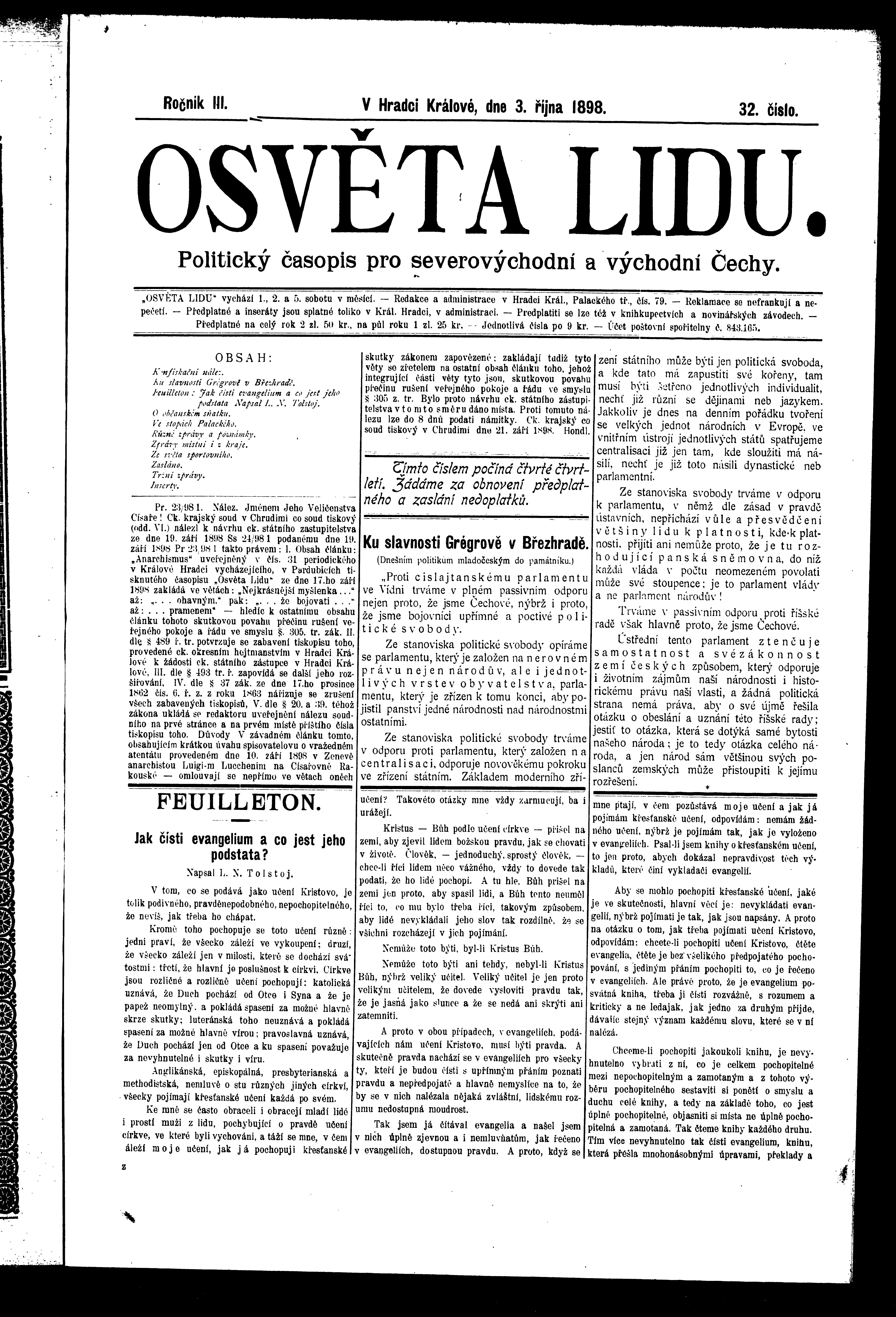 * Datum vydání výtisku: 3.10.1898 Číslo výtisku: 32 Poznámky k výtisku: ranní vydání
