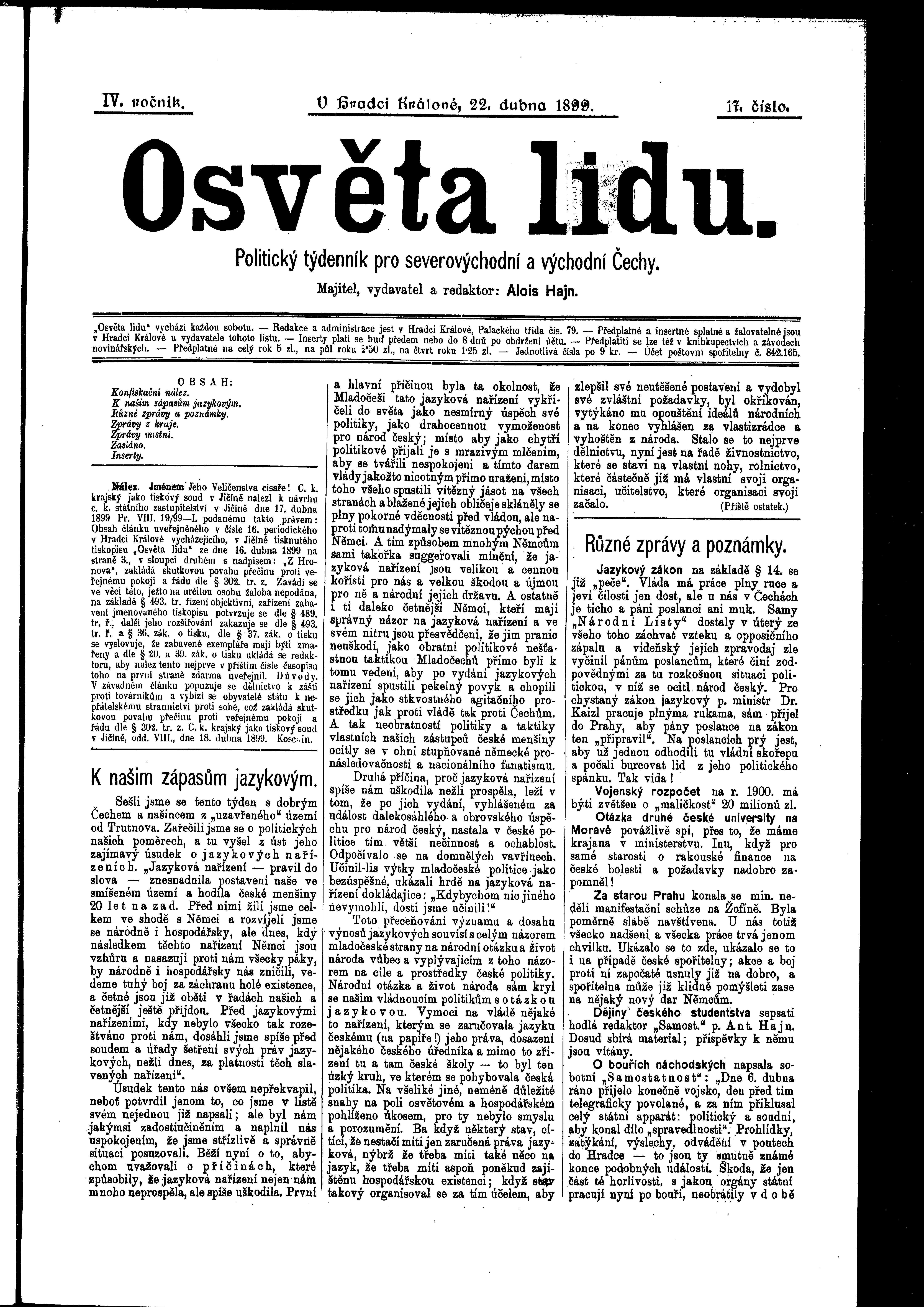 * Datum vydání výtisku: 22.4.1899 Číslo výtisku: 17 Poznámky k výtisku: ranní vydání