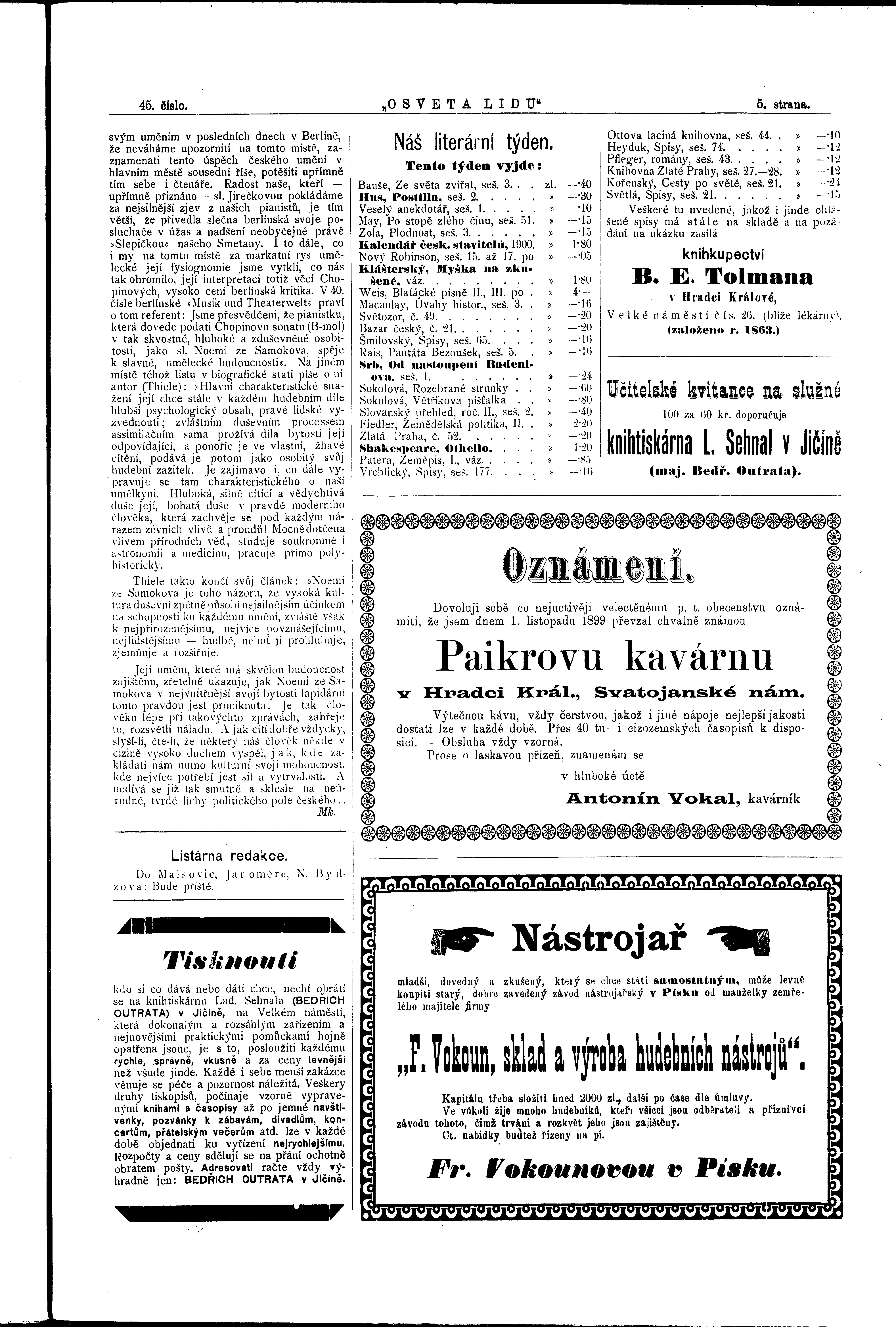 * Datum vydání výtisku: 4.11.1899 Číslo výtisku: 45 Poznámky k výtisku: ranní vydání