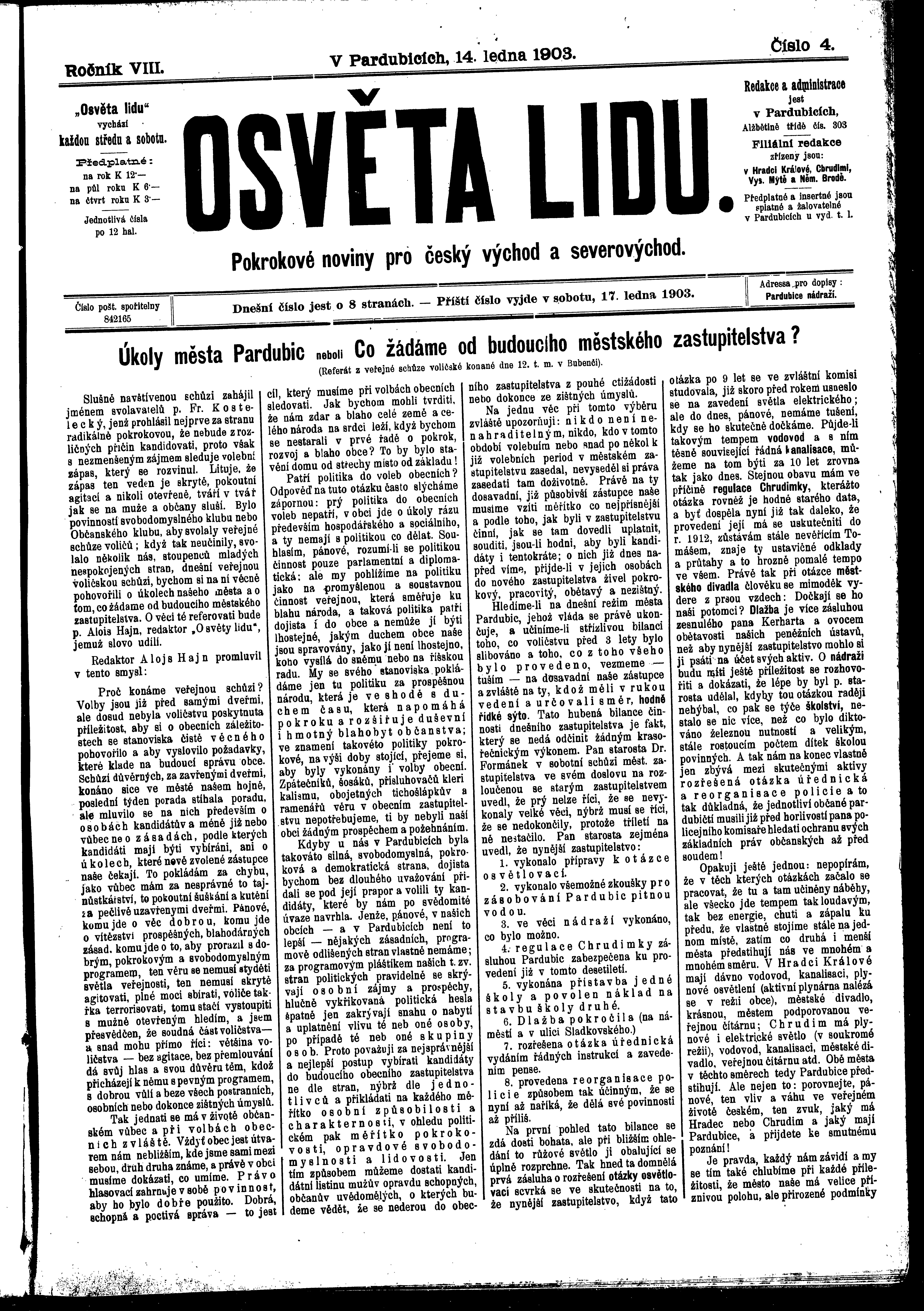 * Datum vydání výtisku: 14.1.1903 Číslo výtisku: 4 Poznámky k výtisku: ranní vydání