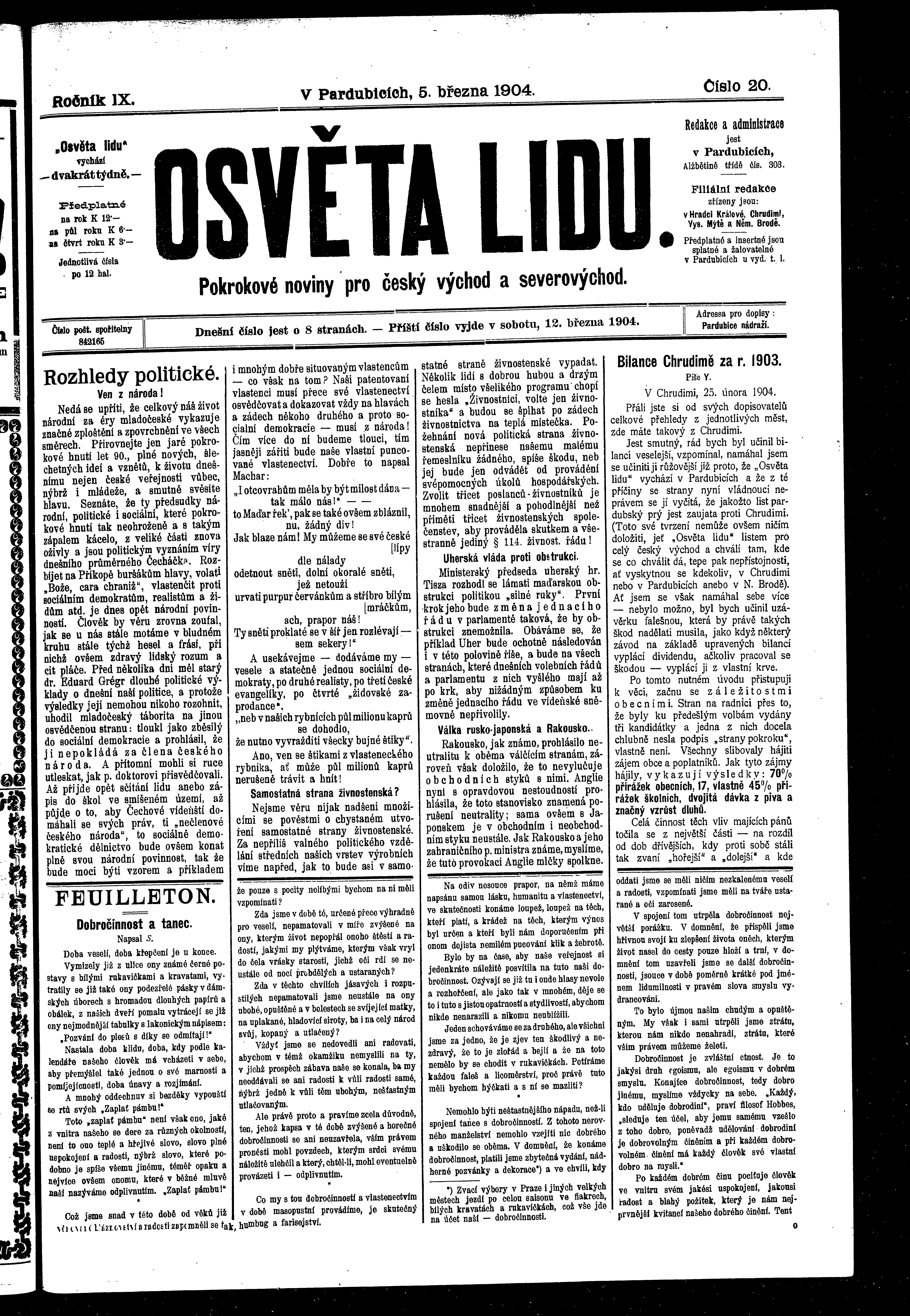 * Datum vydání výtisku: 5.3.1904 Číslo výtisku: 20 Poznámky k výtisku: ranní vydání