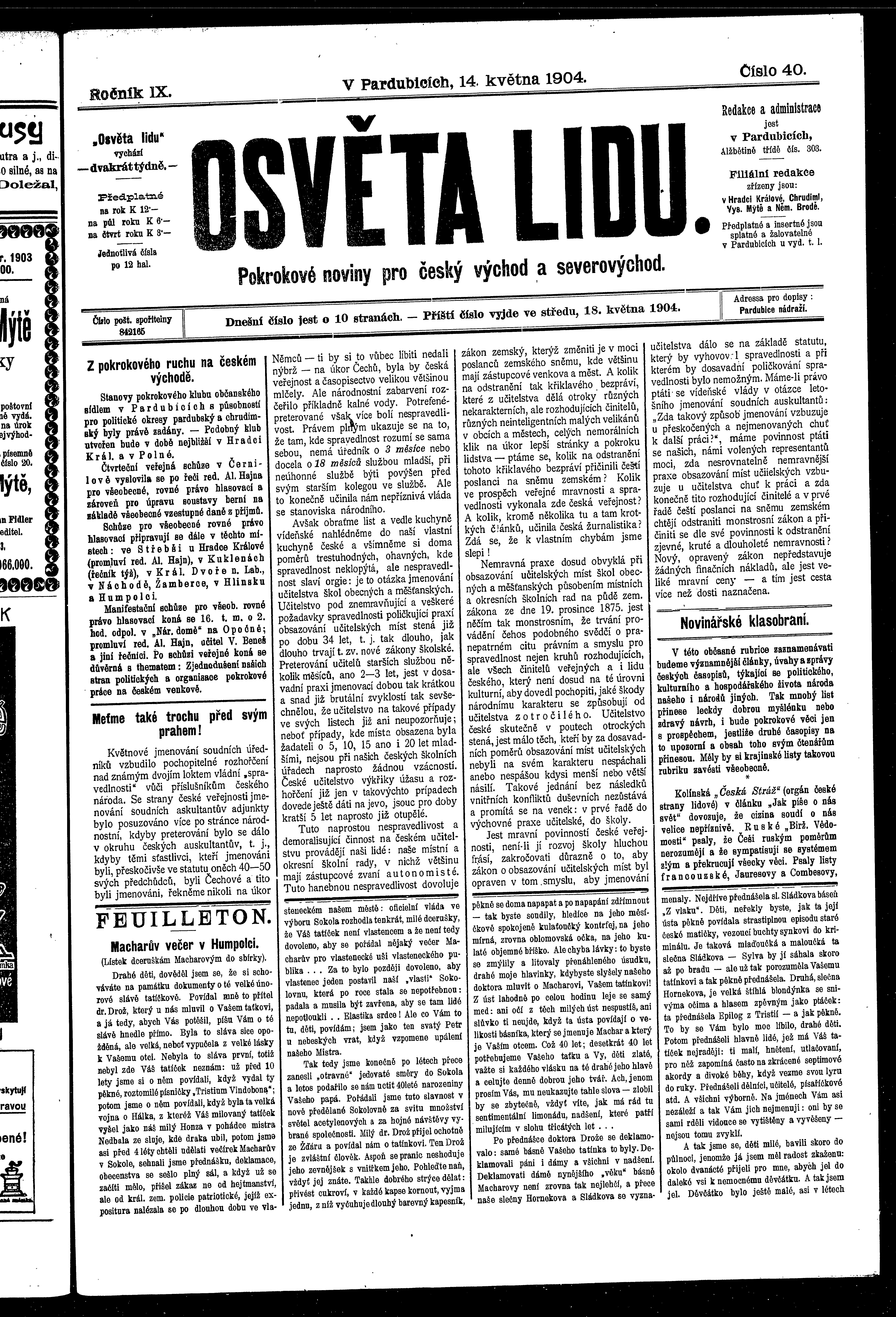 * Datum vydání výtisku: 14.5.1904 Číslo výtisku: 40 Poznámky k výtisku: ranní vydání