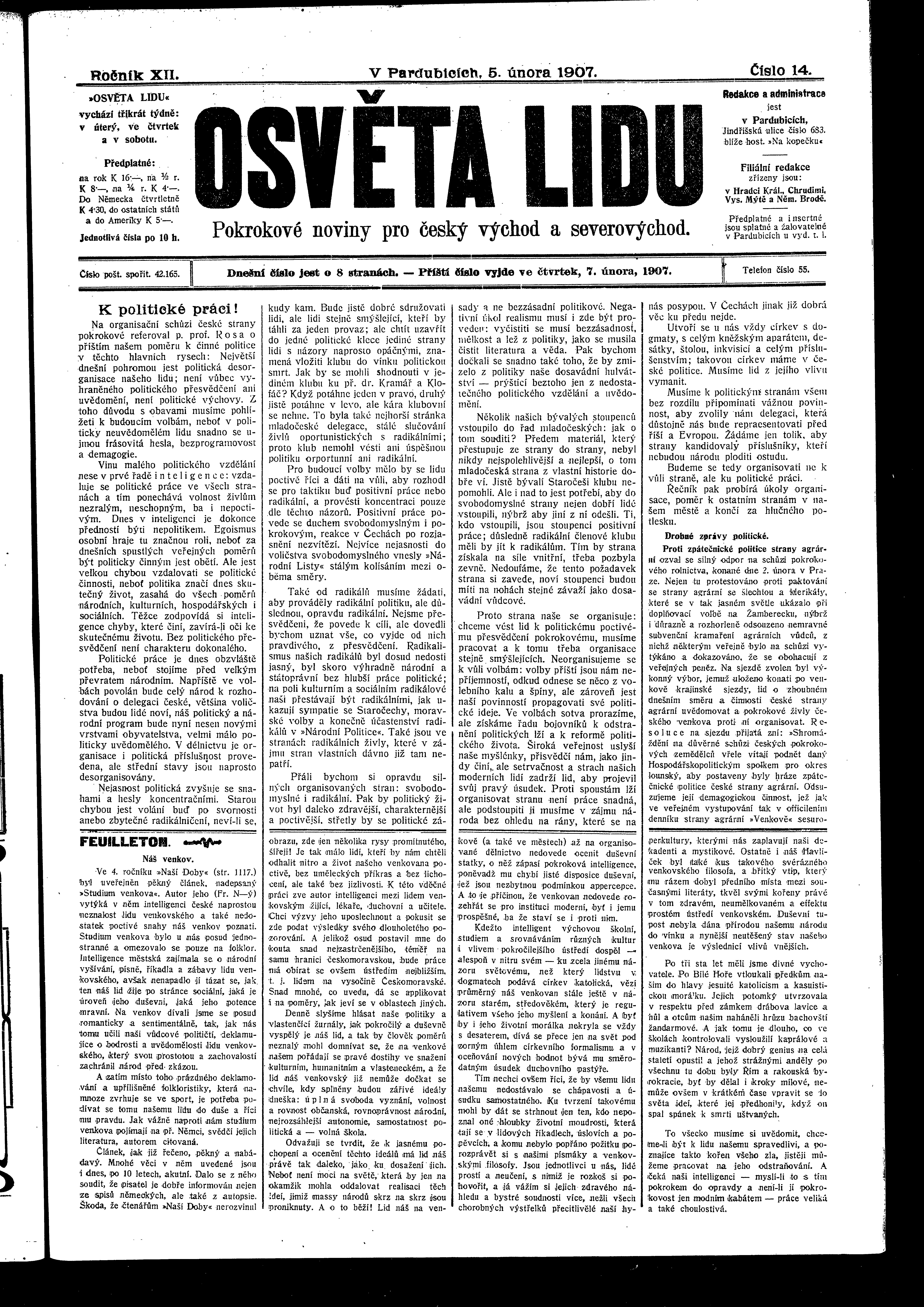 * Datum vydání výtisku: 5.2.1907 Číslo výtisku: 14 Poznámky k výtisku: ranní vydání
