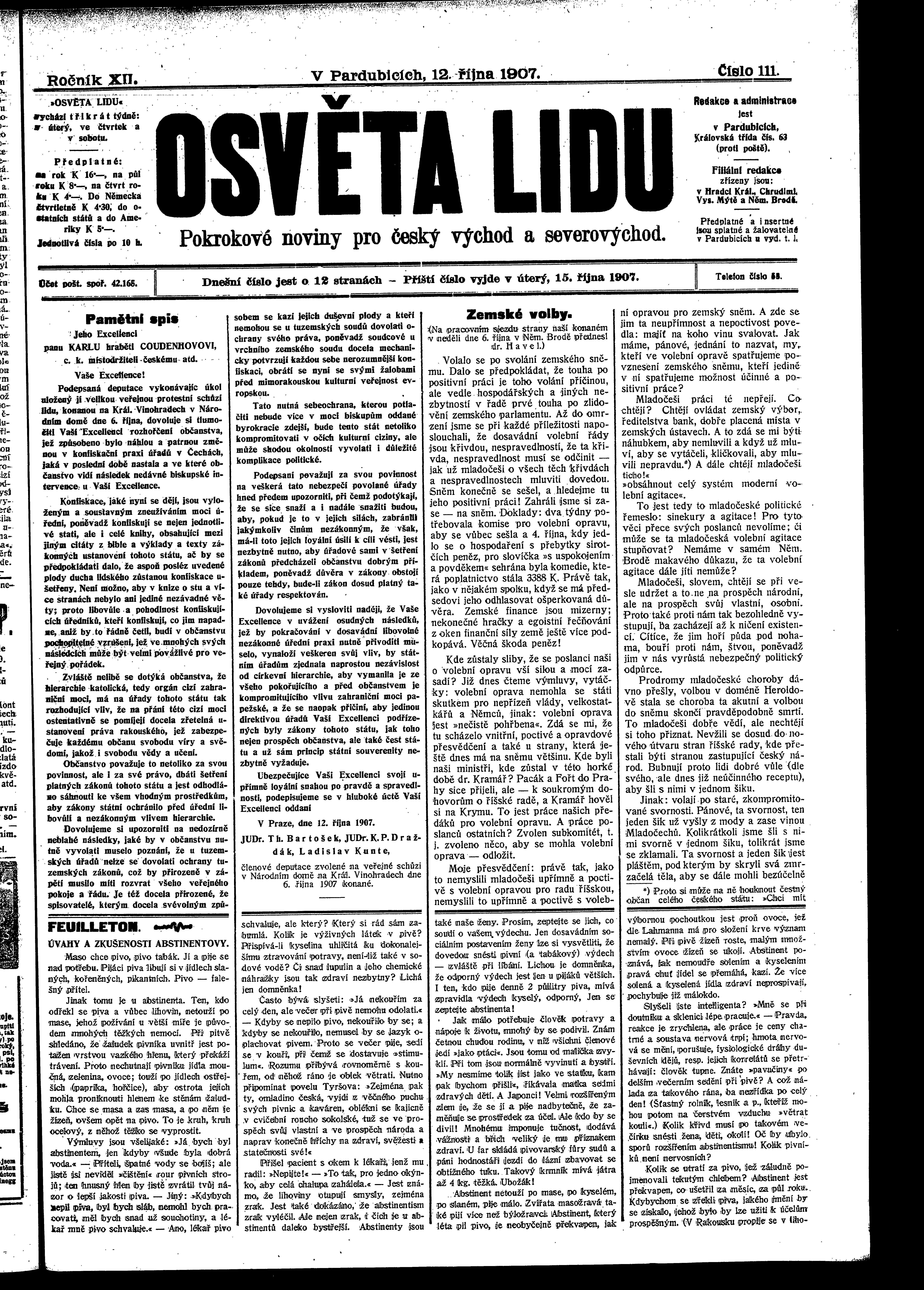 * Datum vydání výtisku: 12.10.1907 Číslo výtisku: 111 Poznámky k výtisku: ranní vydání
