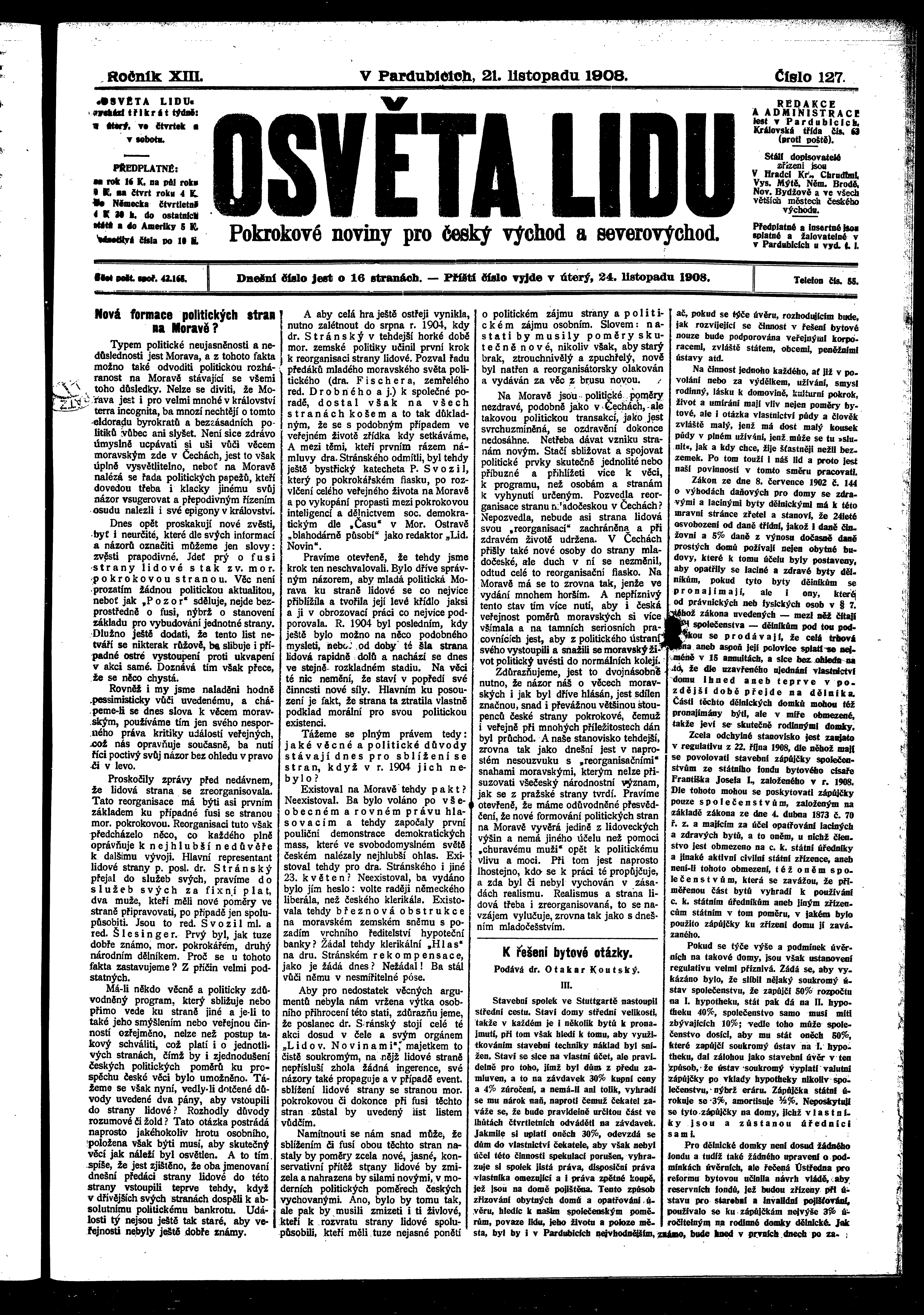 * Datum vydání výtisku: 21.11.1908 Číslo výtisku: 127 Poznámky k výtisku: ranní vydání