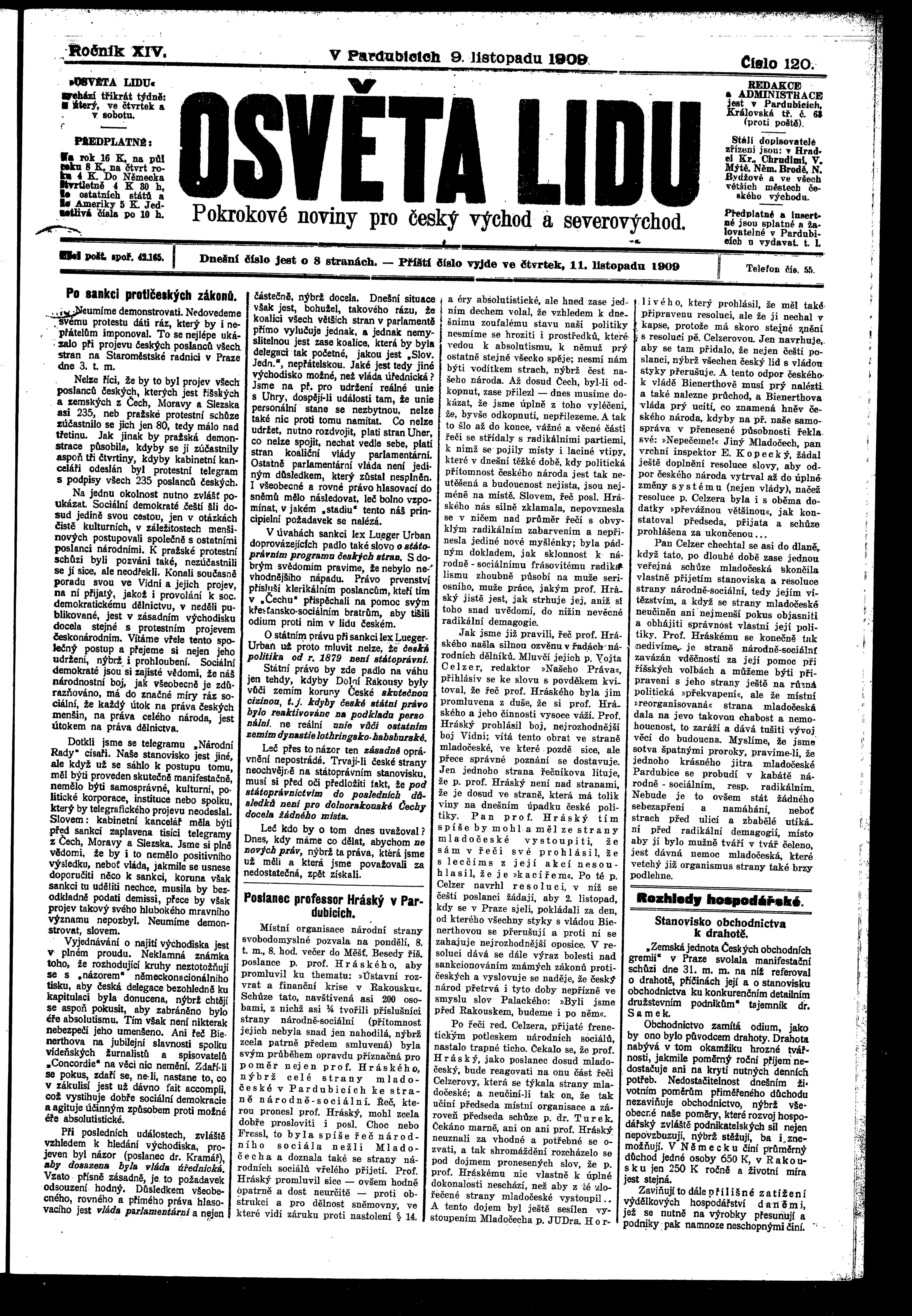 * Datum vydání výtisku: 9.11.1909 Číslo výtisku: 120 Poznámky k výtisku: ranní vydání