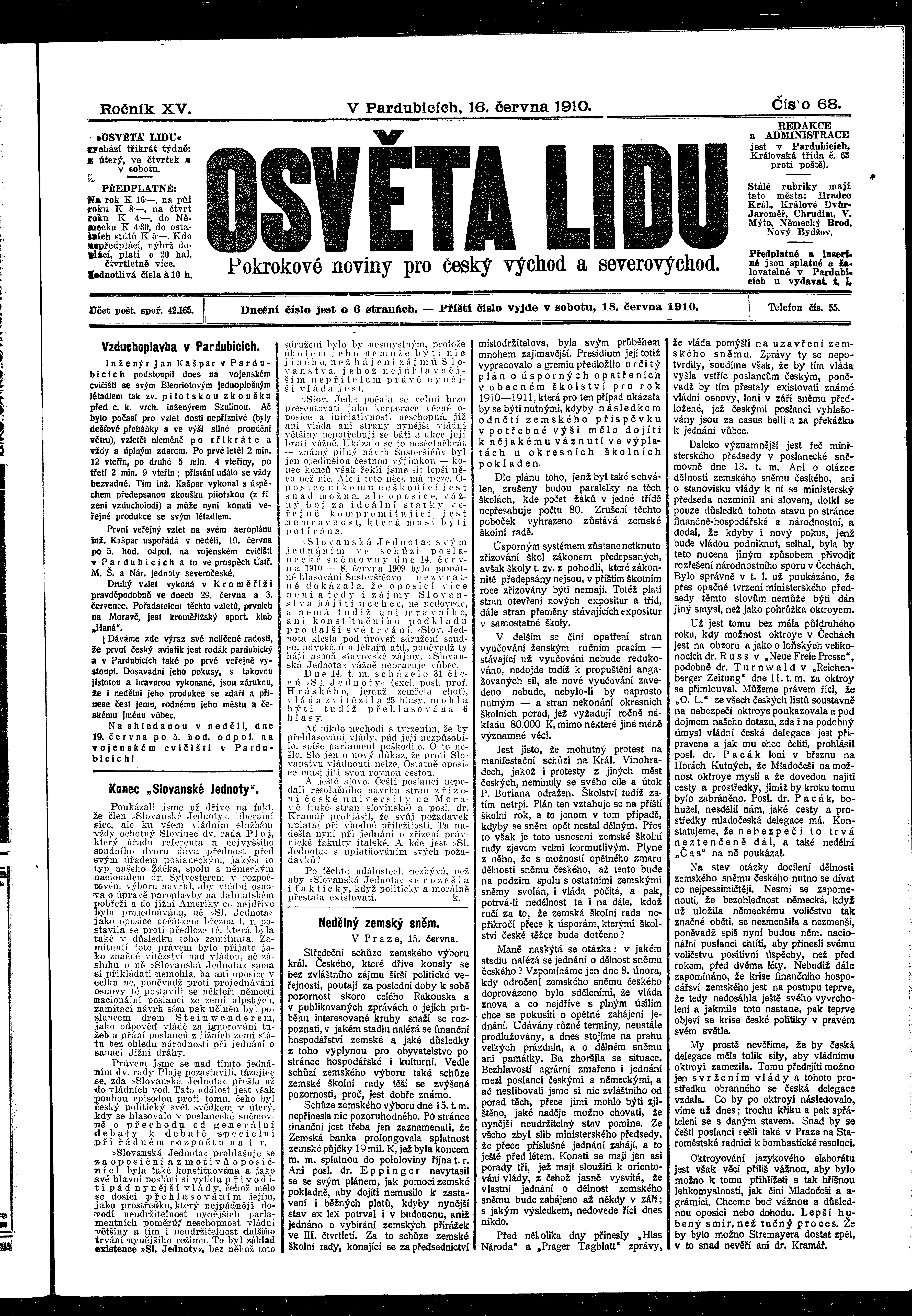 * Datum vydání výtisku: 16.6.1910 Číslo výtisku: 68 Poznámky k výtisku: ranní vydání