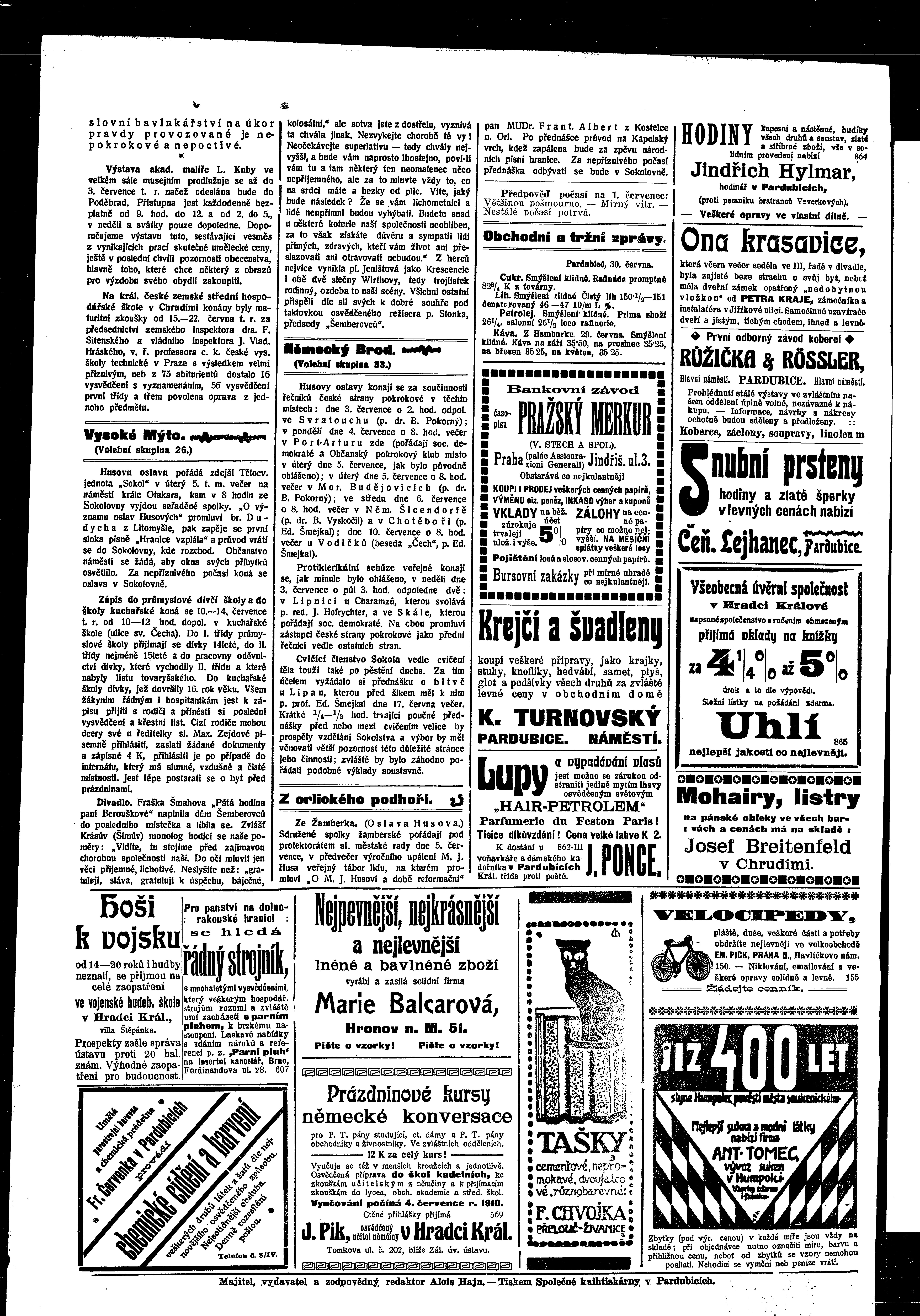 * Datum vydání výtisku: 30.6.1910 Číslo výtisku: 74 Poznámky k výtisku: ranní vydání