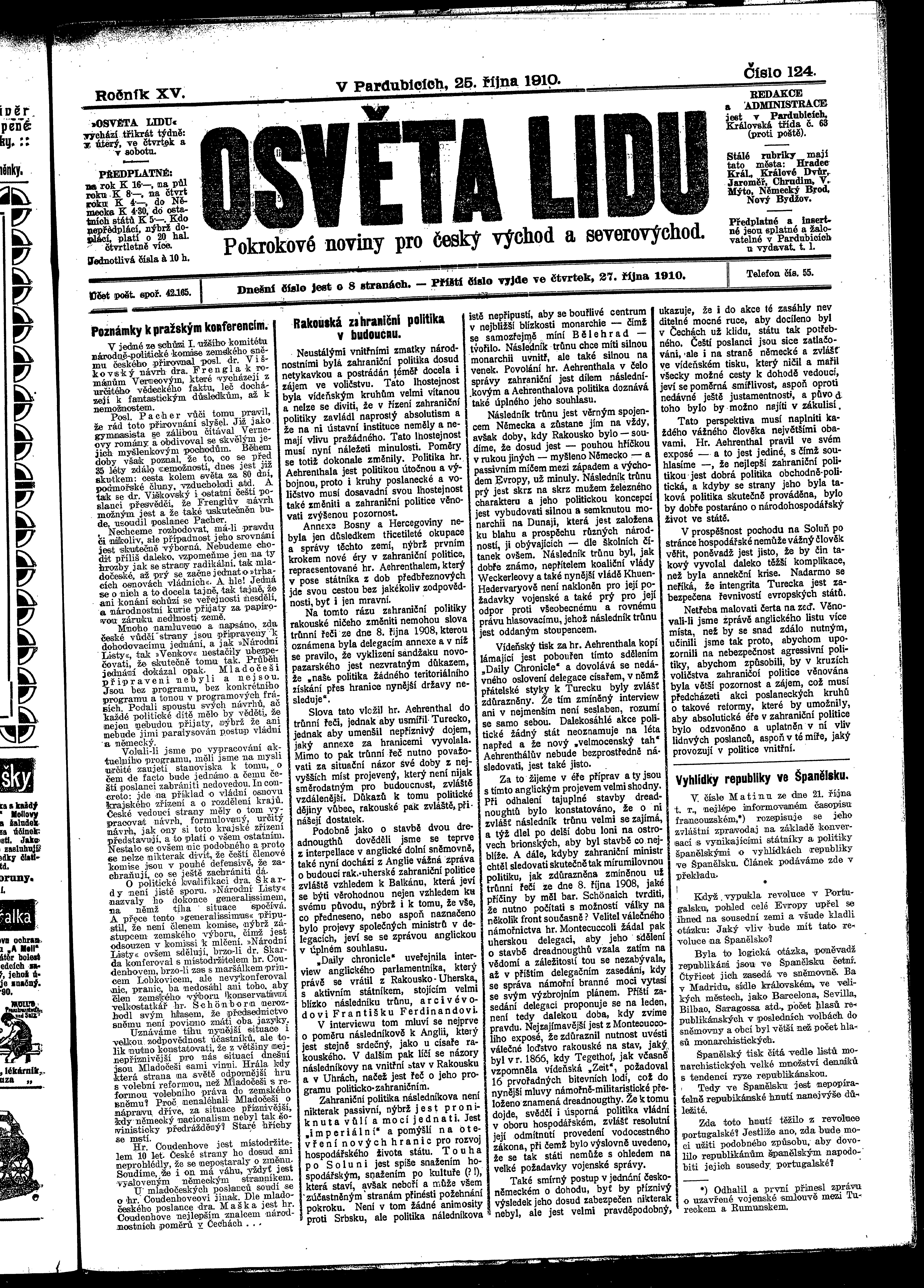 * Datum vydání výtisku: 25.10.1910 Číslo výtisku: 124 Poznámky k výtisku: ranní vydání
