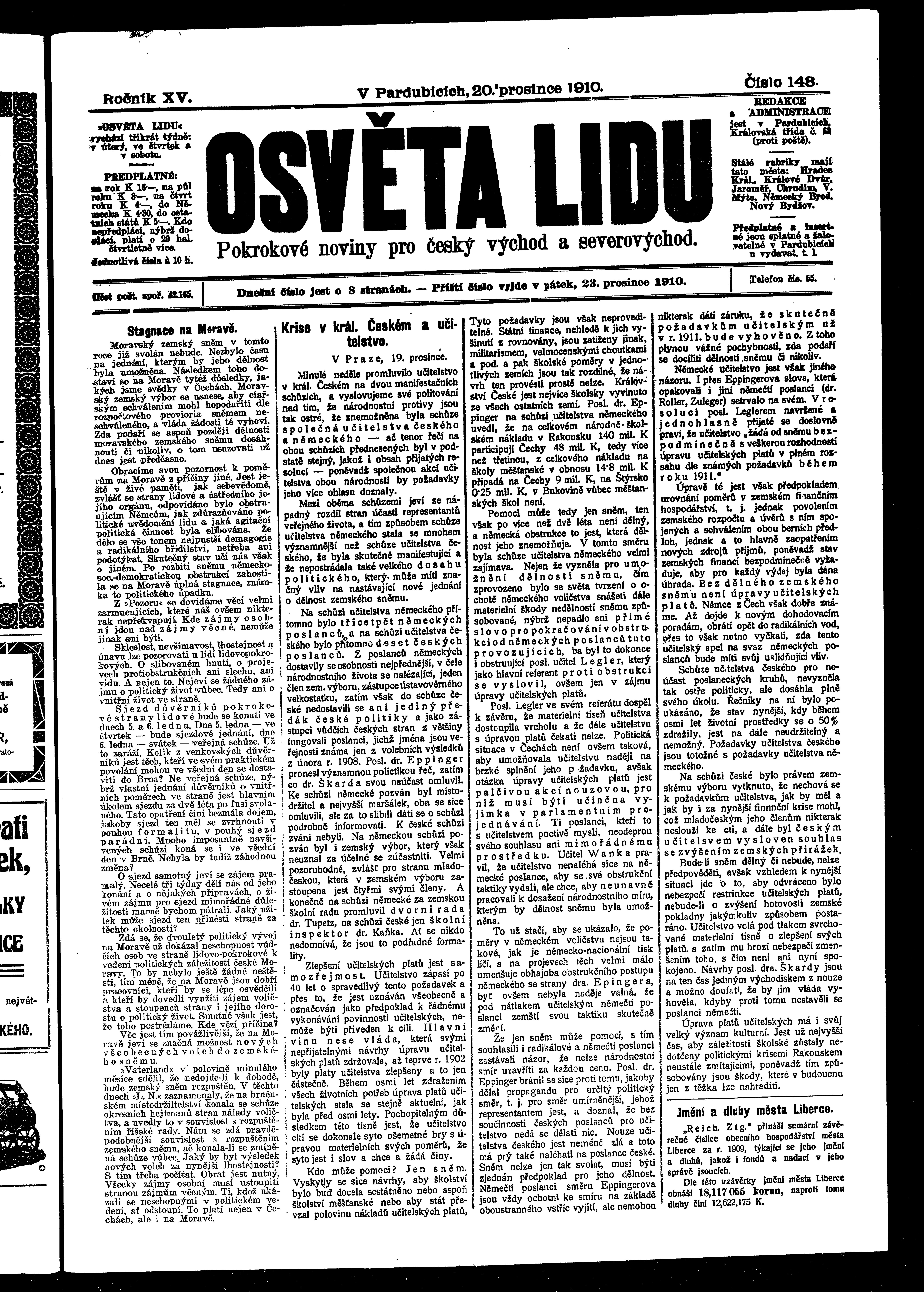 * Datum vydání výtisku: 20.12.1910 Číslo výtisku: 148 Poznámky k výtisku: ranní vydání