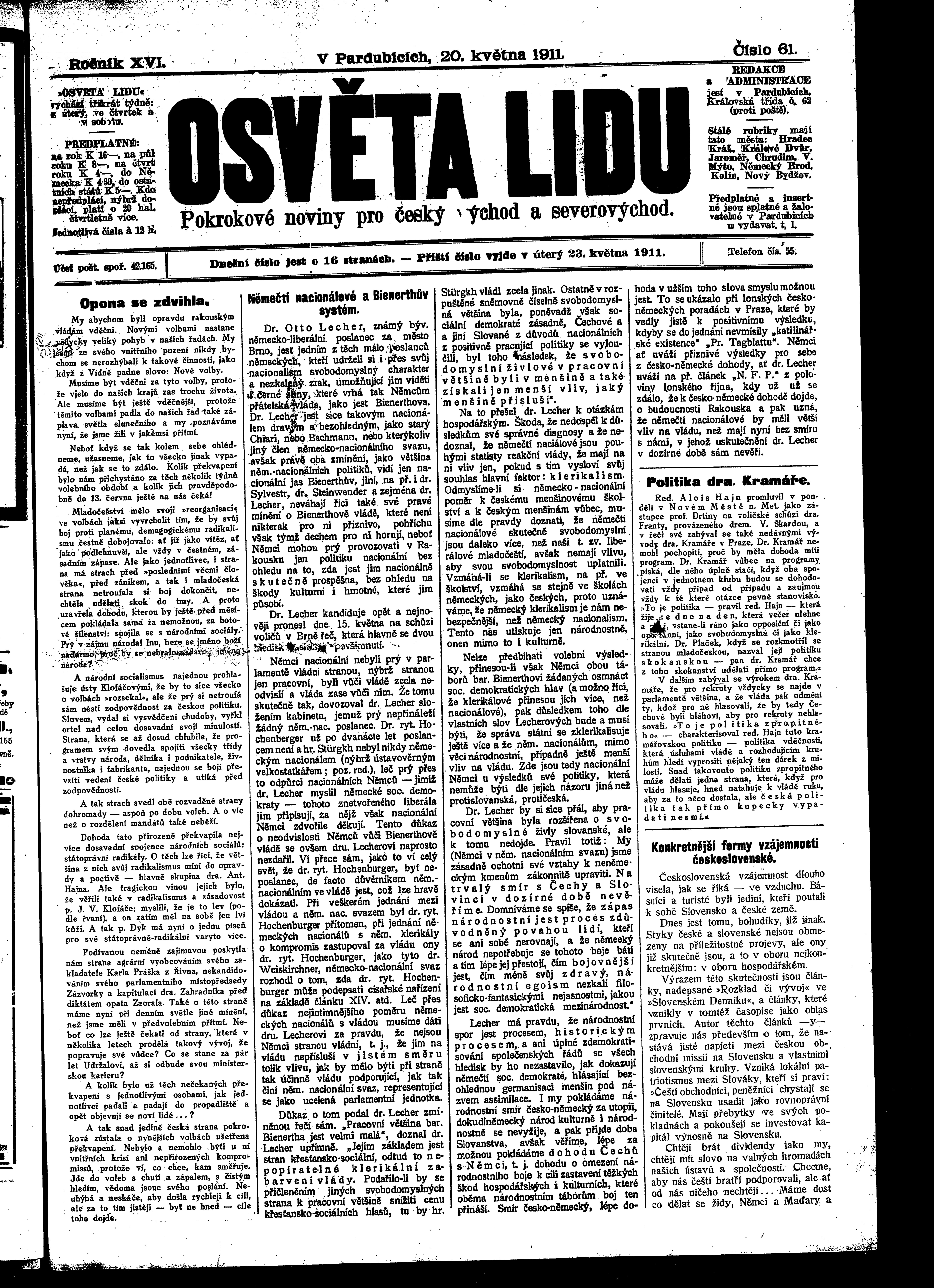 * Datum vydání výtisku: 20.5.1911 Číslo výtisku: 61 Poznámky k výtisku: ranní vydání