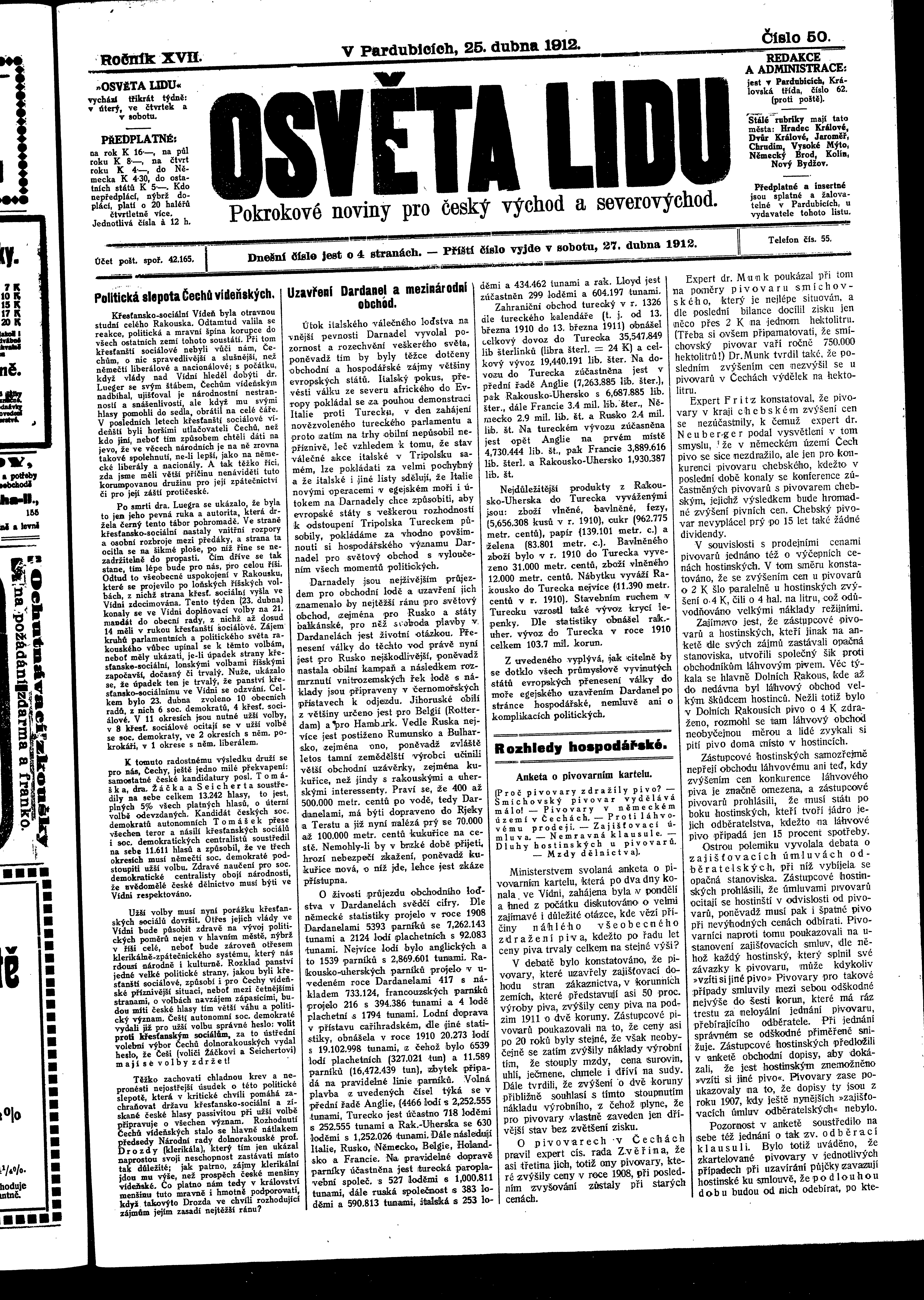 * Datum vydání výtisku: 25.4.1912 Číslo výtisku: 50 Poznámky k výtisku: ranní vydání