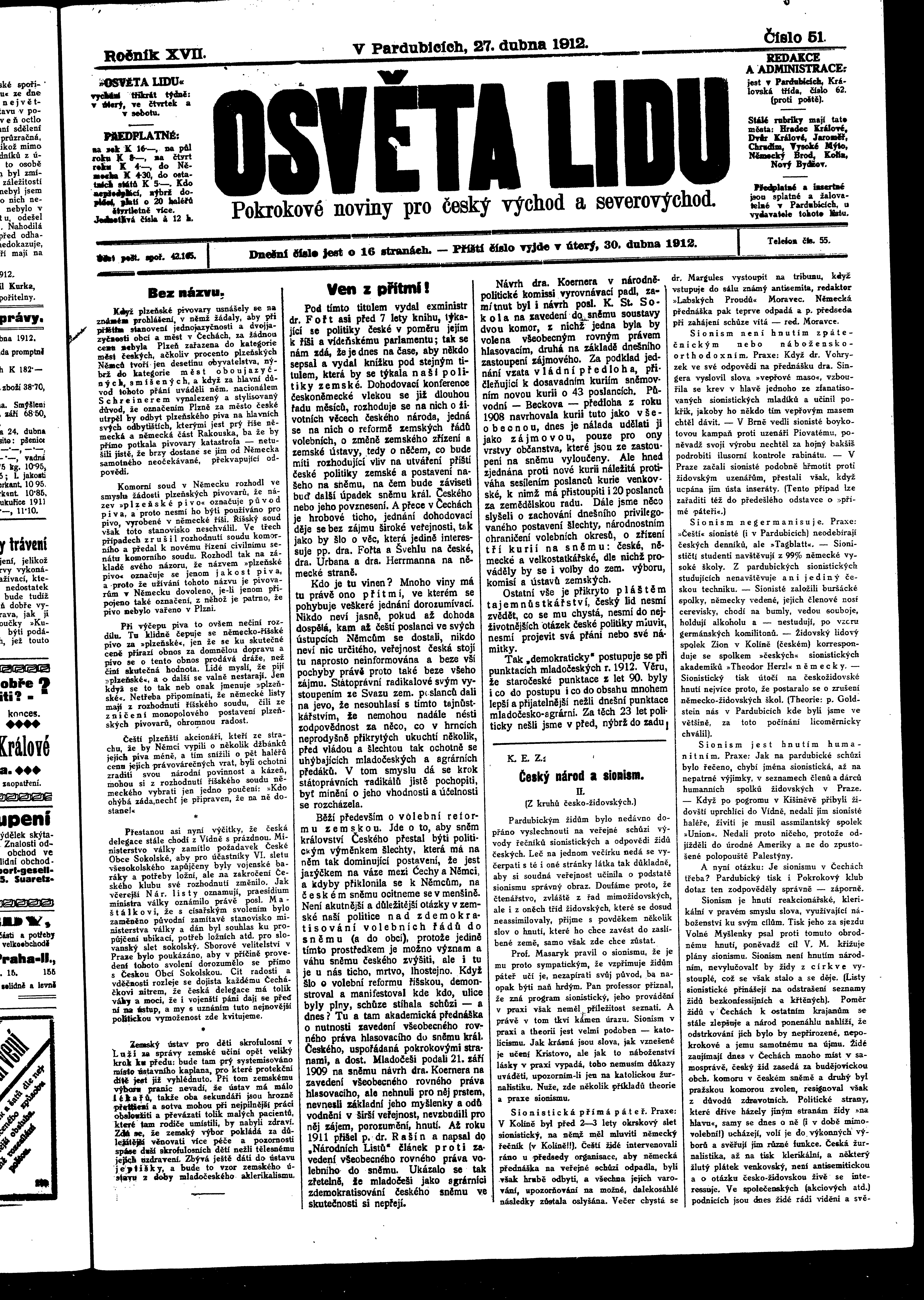 * Datum vydání výtisku: 27.4.1912 Číslo výtisku: 51 Poznámky k výtisku: ranní vydání