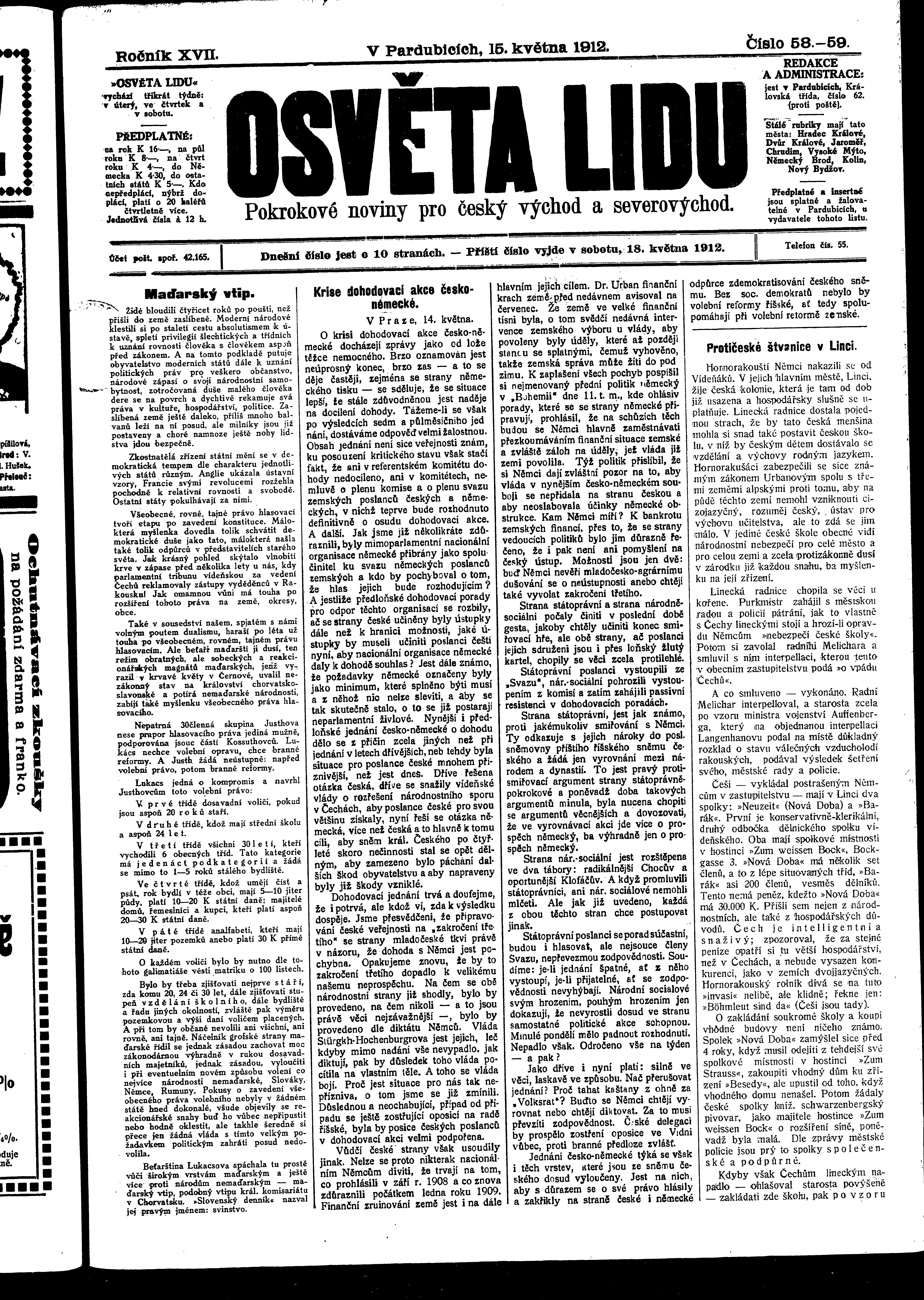 * Datum vydání výtisku: 15.5.1912 Číslo výtisku: 58 - 59 Poznámky k výtisku: ranní vydání
