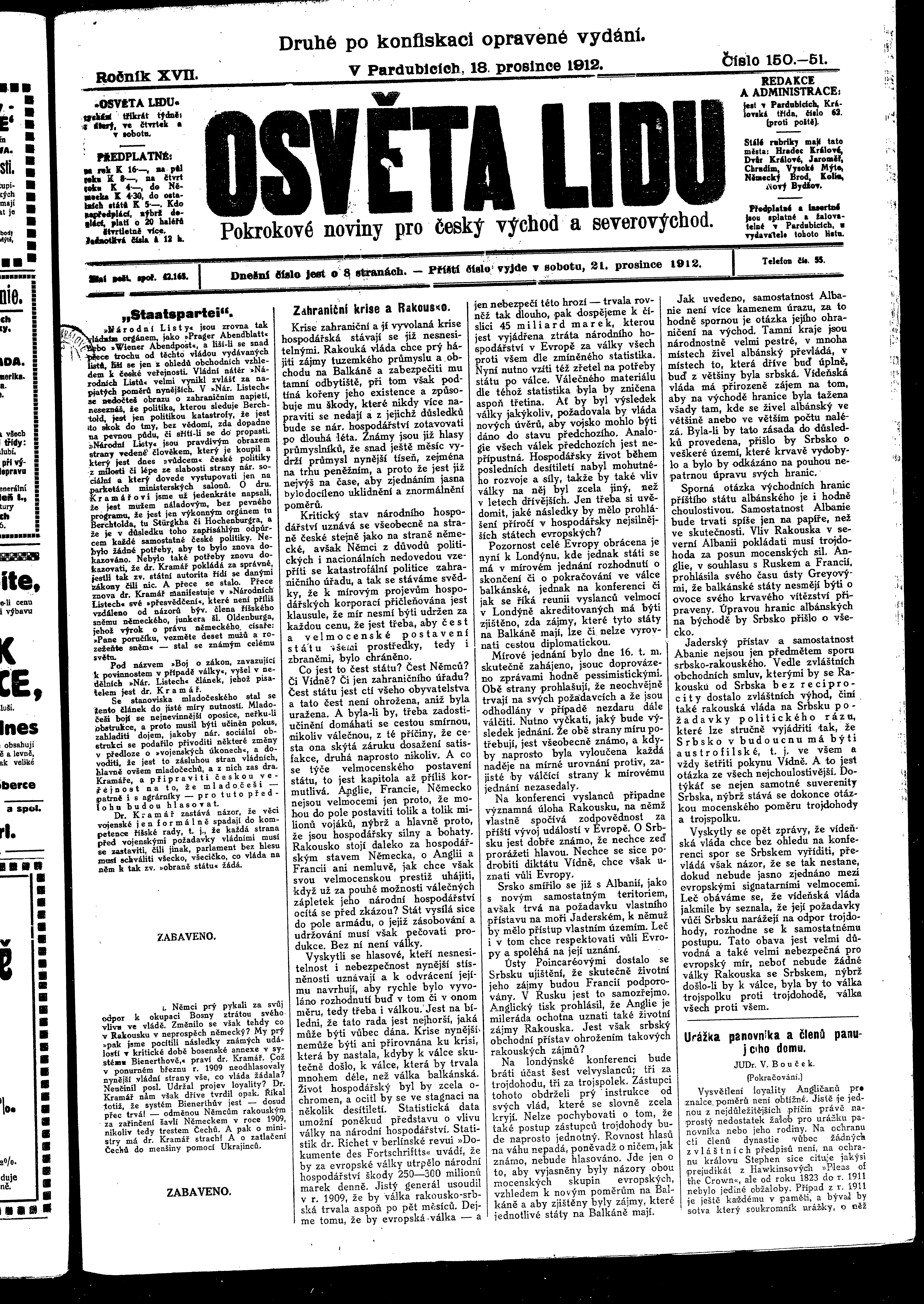 * Datum vydání výtisku: 18.12.1912 Číslo výtisku: 150 - 151 Poznámky k výtisku: ranní vydání