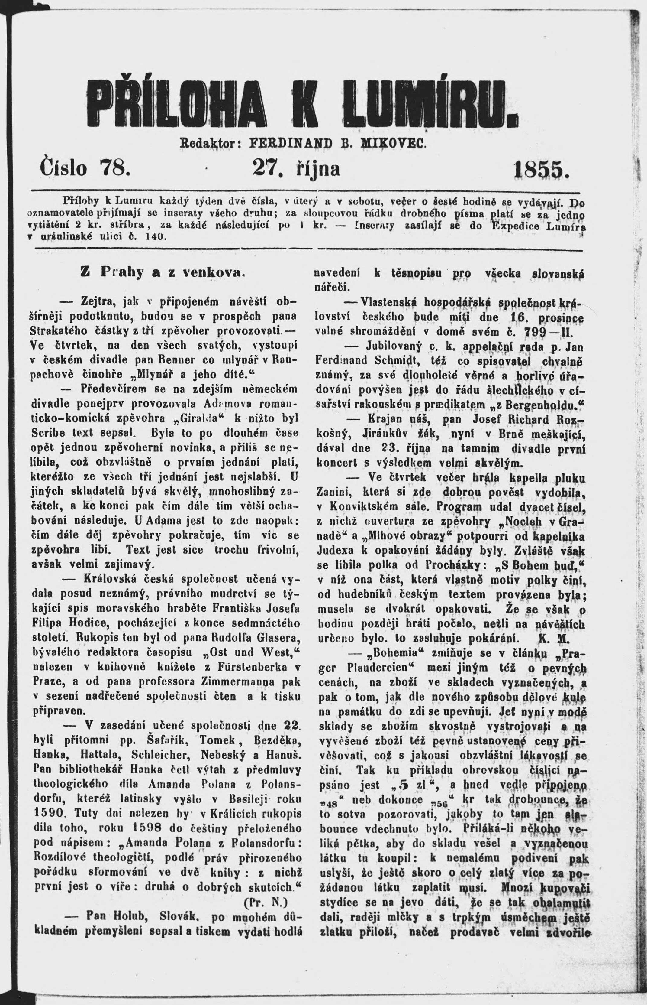 * Datum vydání výtisku: 27.10.1855 Číslo výtisku: 78 Typ výtisku: příloha