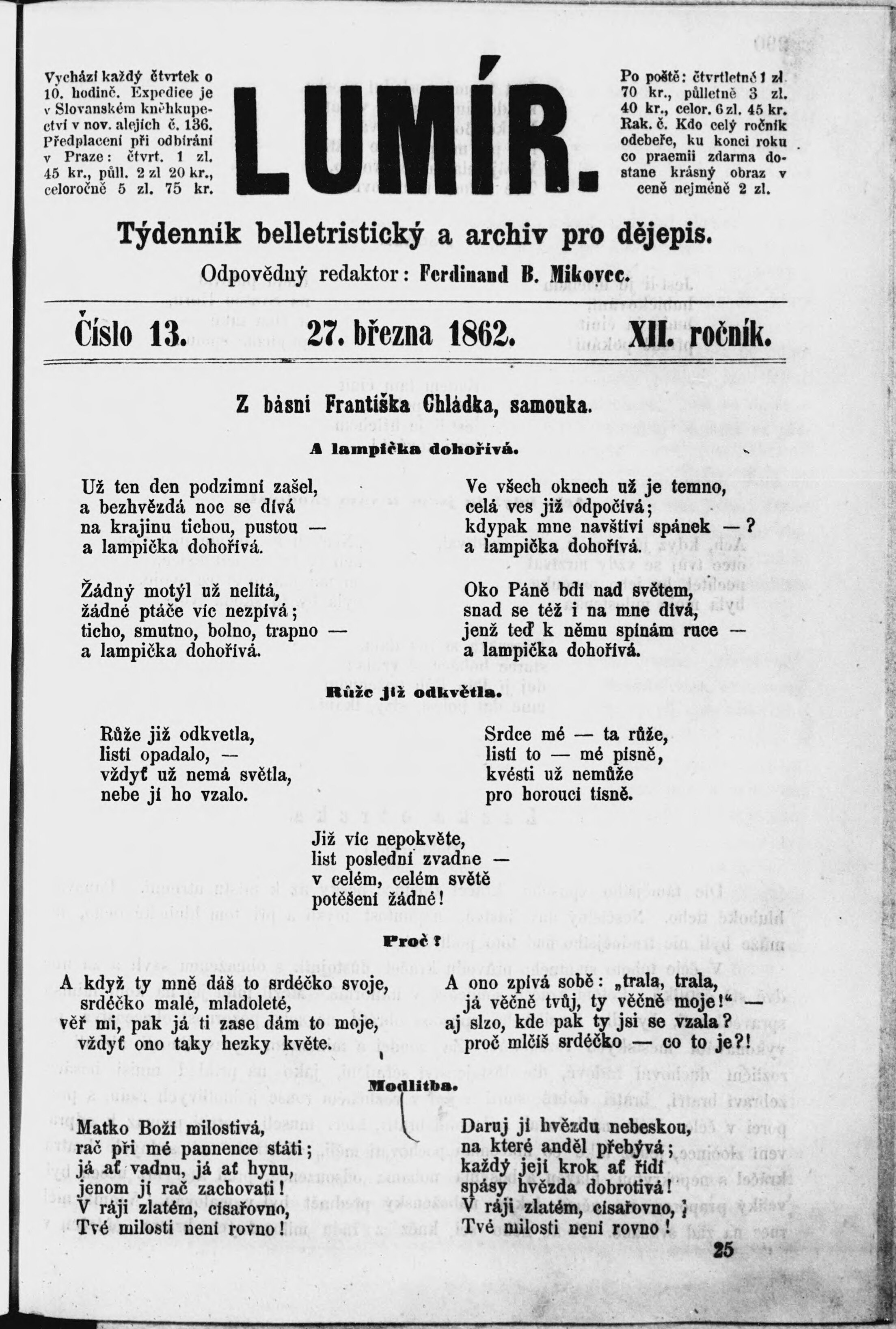 * Datum vydání výtisku: 27.3.1862 Číslo výtisku: 13