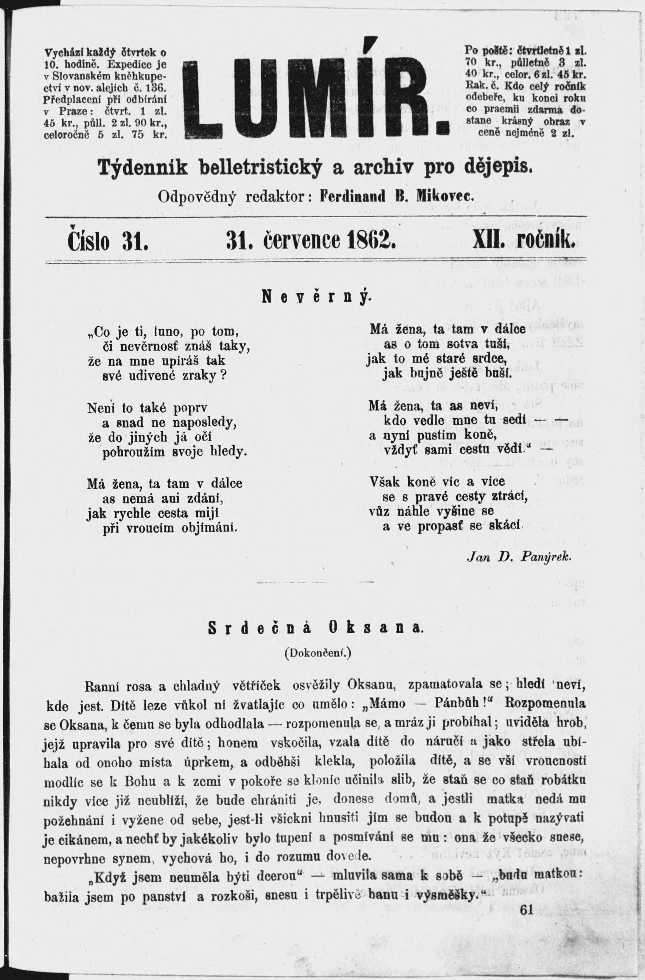 * Datum vydání výtisku: 31.7.1862 Číslo výtisku: 31