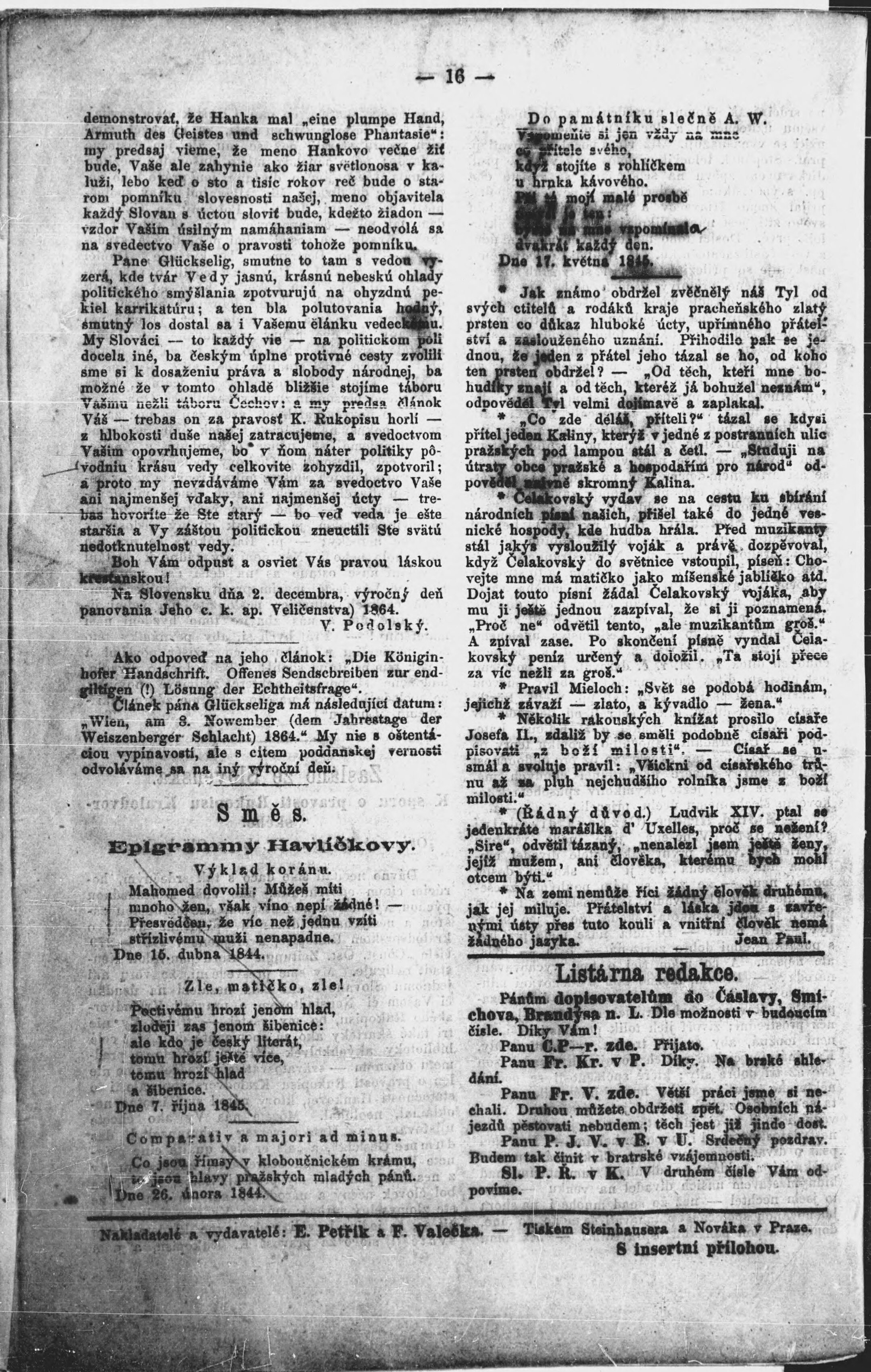* Datum vydání výtisku: 5.1.1865 Číslo výtisku: 1