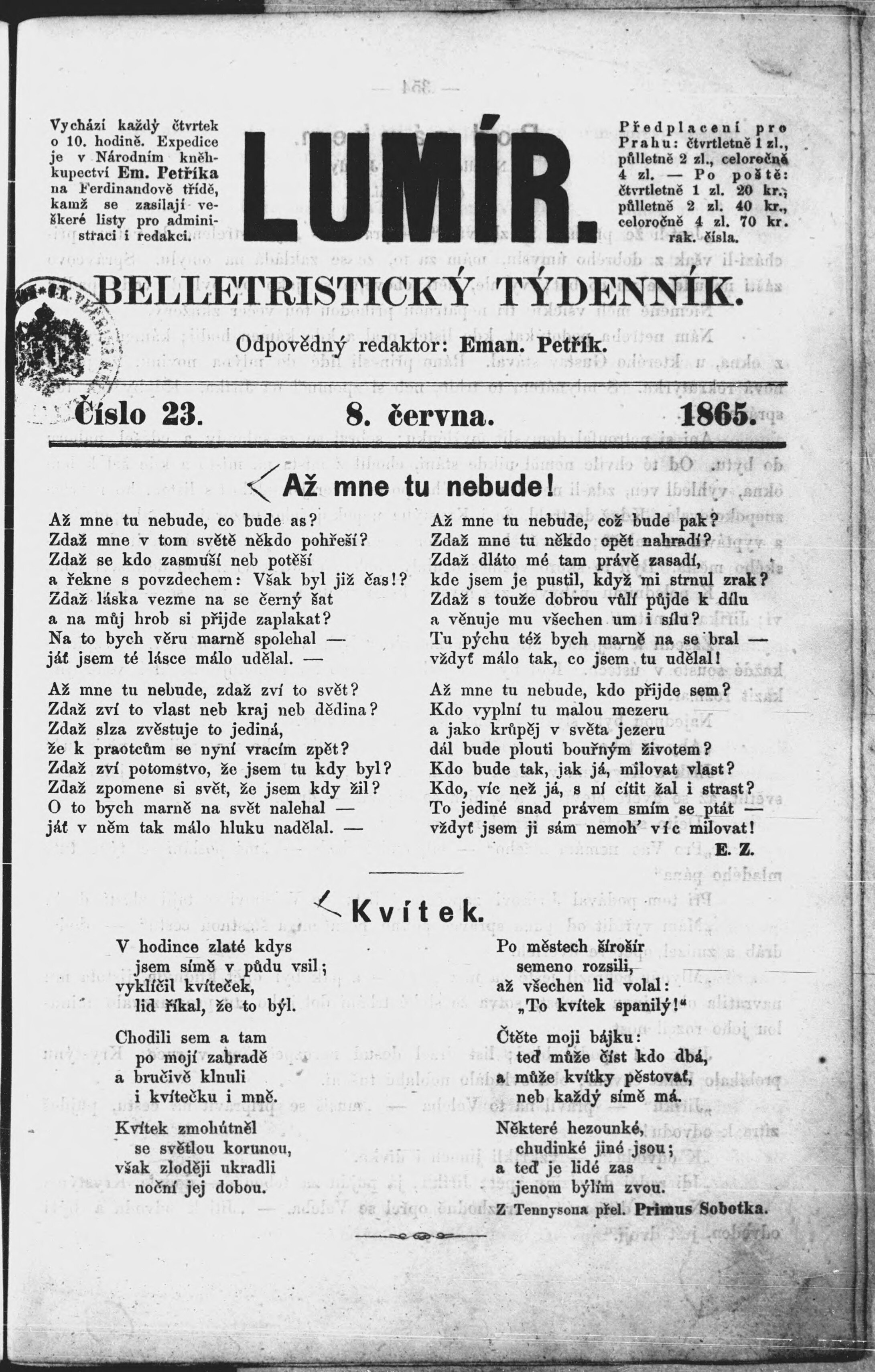* Datum vydání výtisku: 8.6.1865 Číslo výtisku: 23