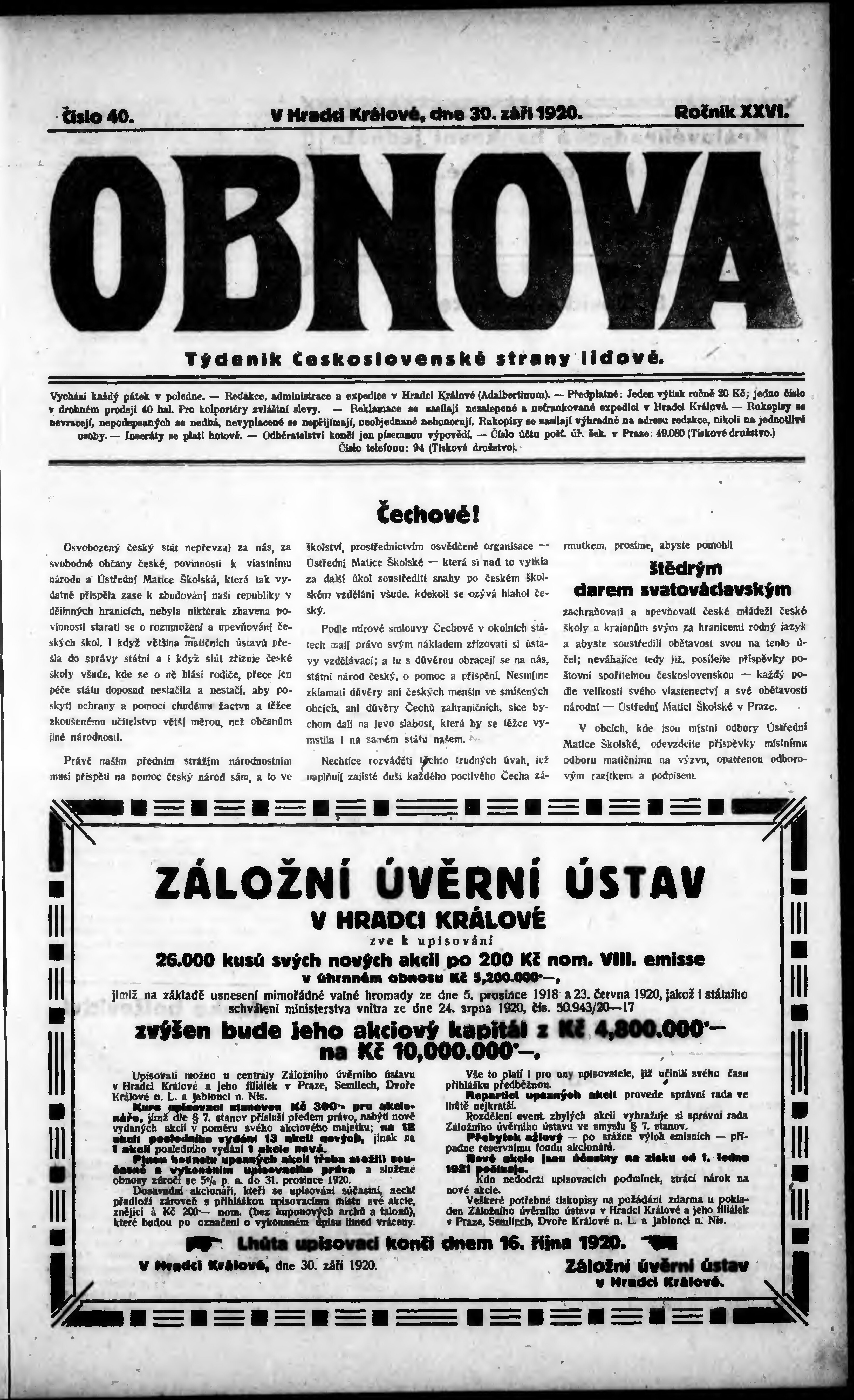 * Datum vydání výtisku: 30.9.1920 Číslo výtisku: 40