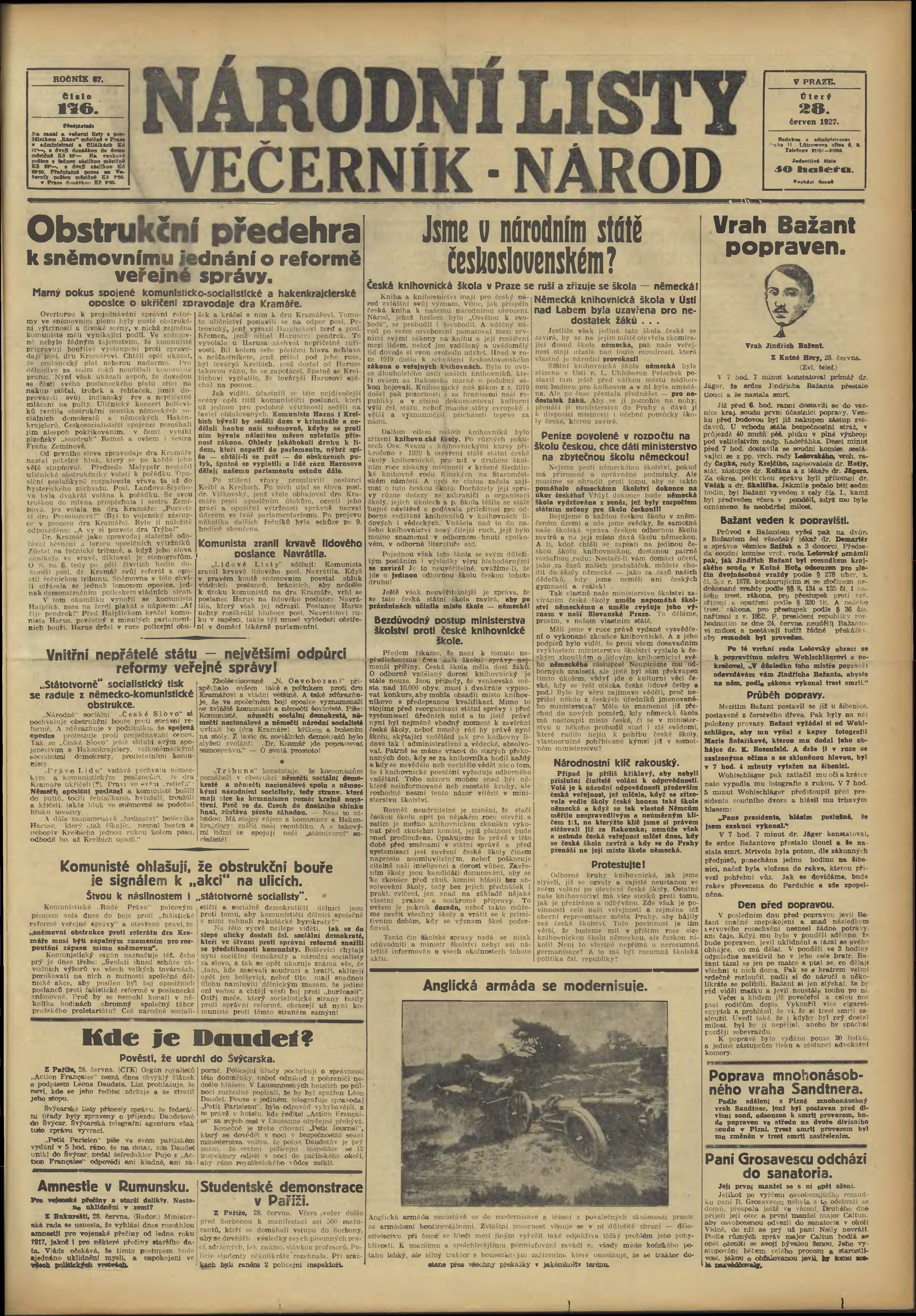 * Datum vydání výtisku: 28.6.1927 Číslo výtisku: 176 Poznámky k výtisku: večerní vydání;
