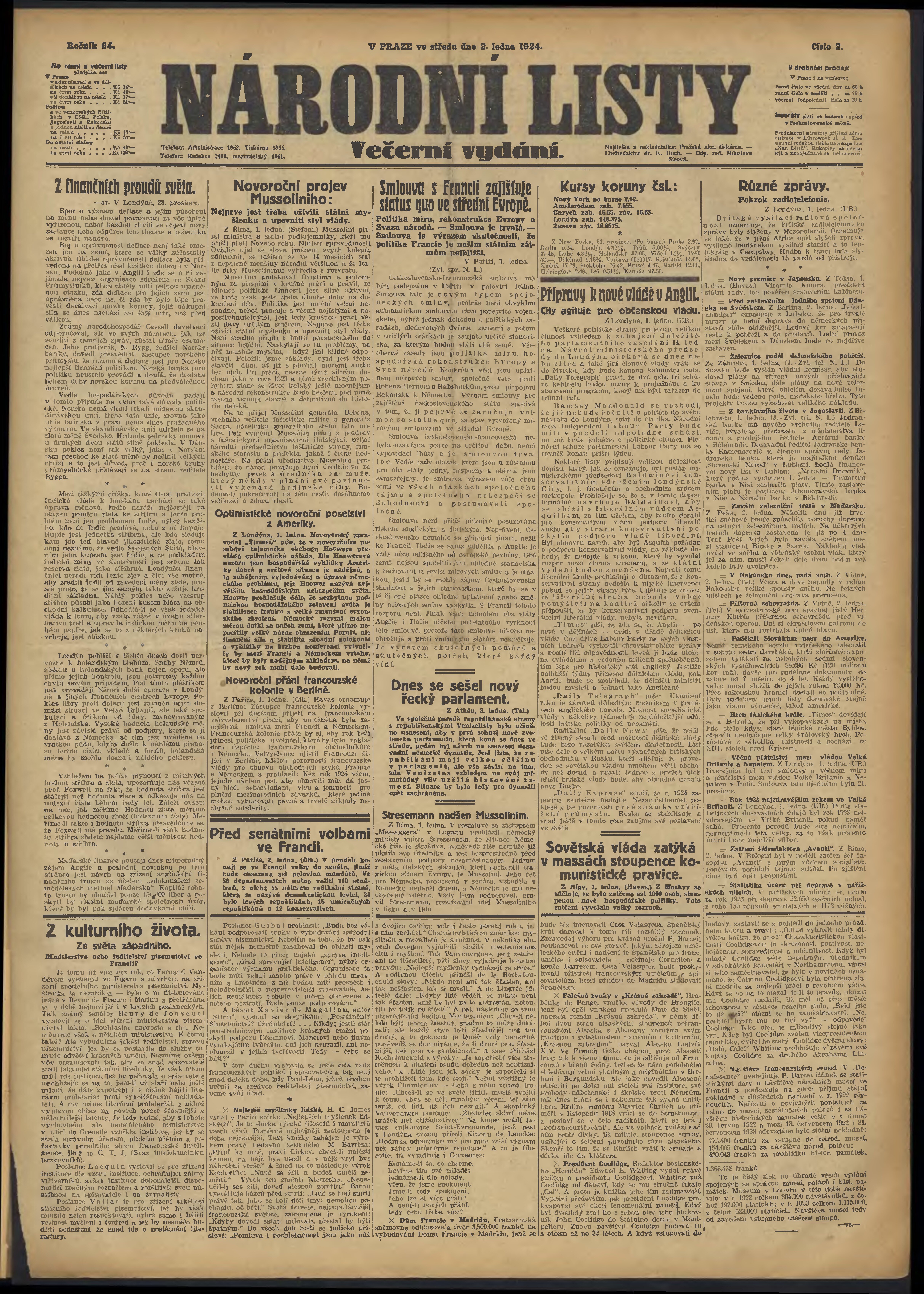 * Datum vydání výtisku: 2.1.1924 Číslo výtisku: 2 Poznámky k výtisku: večerní vydání;