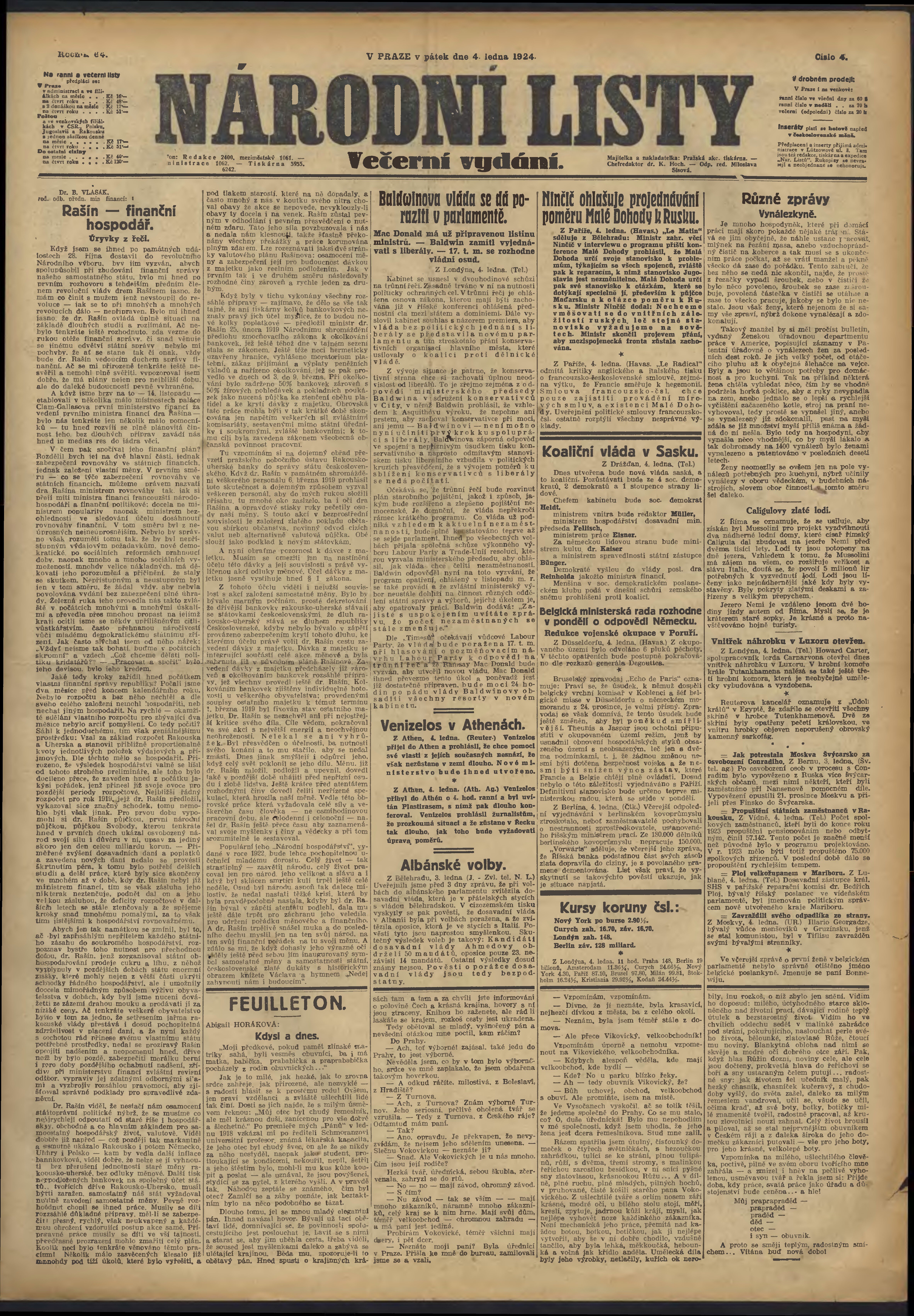 * Datum vydání výtisku: 4.1.1924 Číslo výtisku: 4 Poznámky k výtisku: večerní vydání;