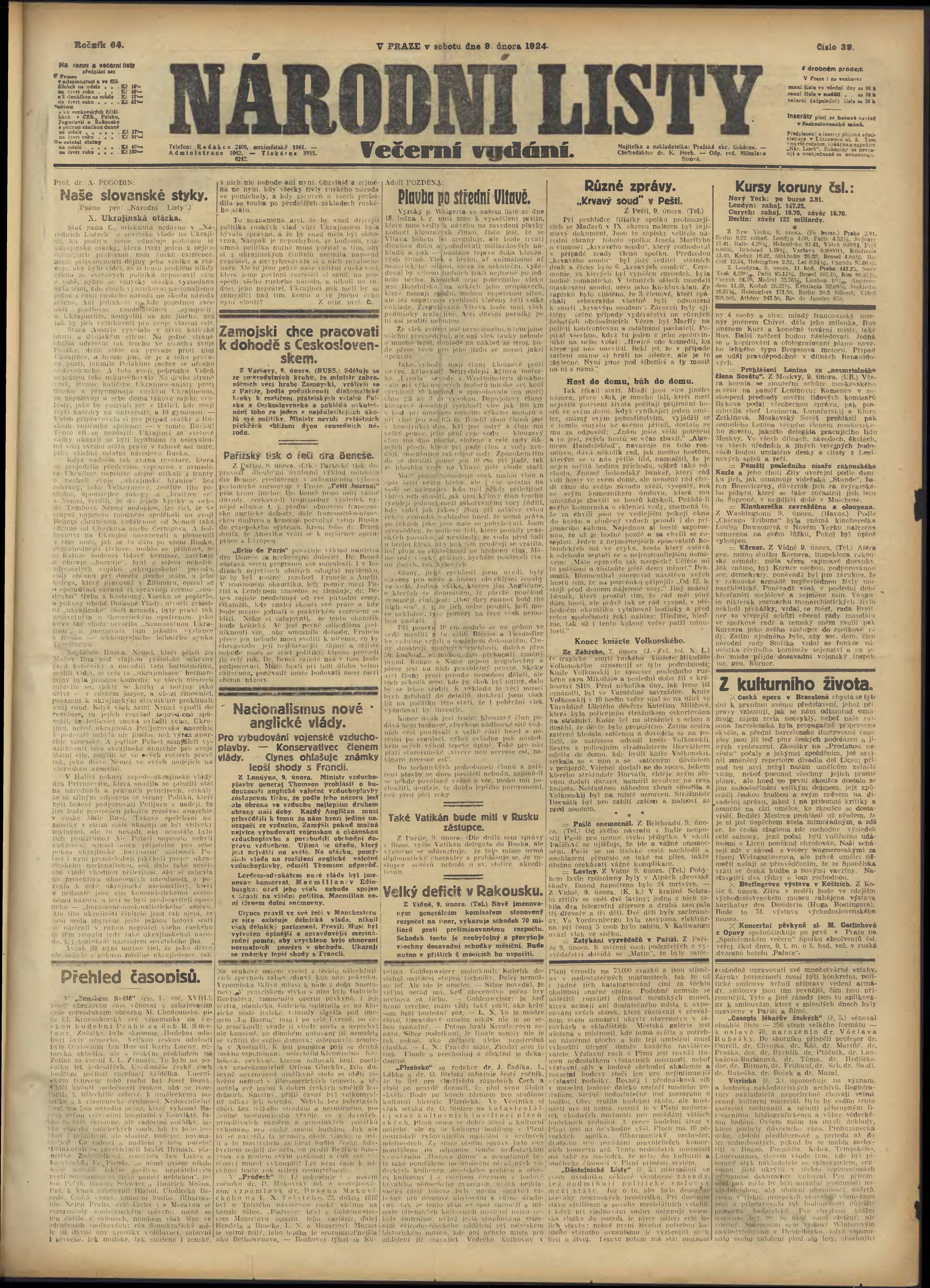 * Datum vydání výtisku: 9.2.1924 Číslo výtisku: 39 Poznámky k výtisku: večerní vydání;