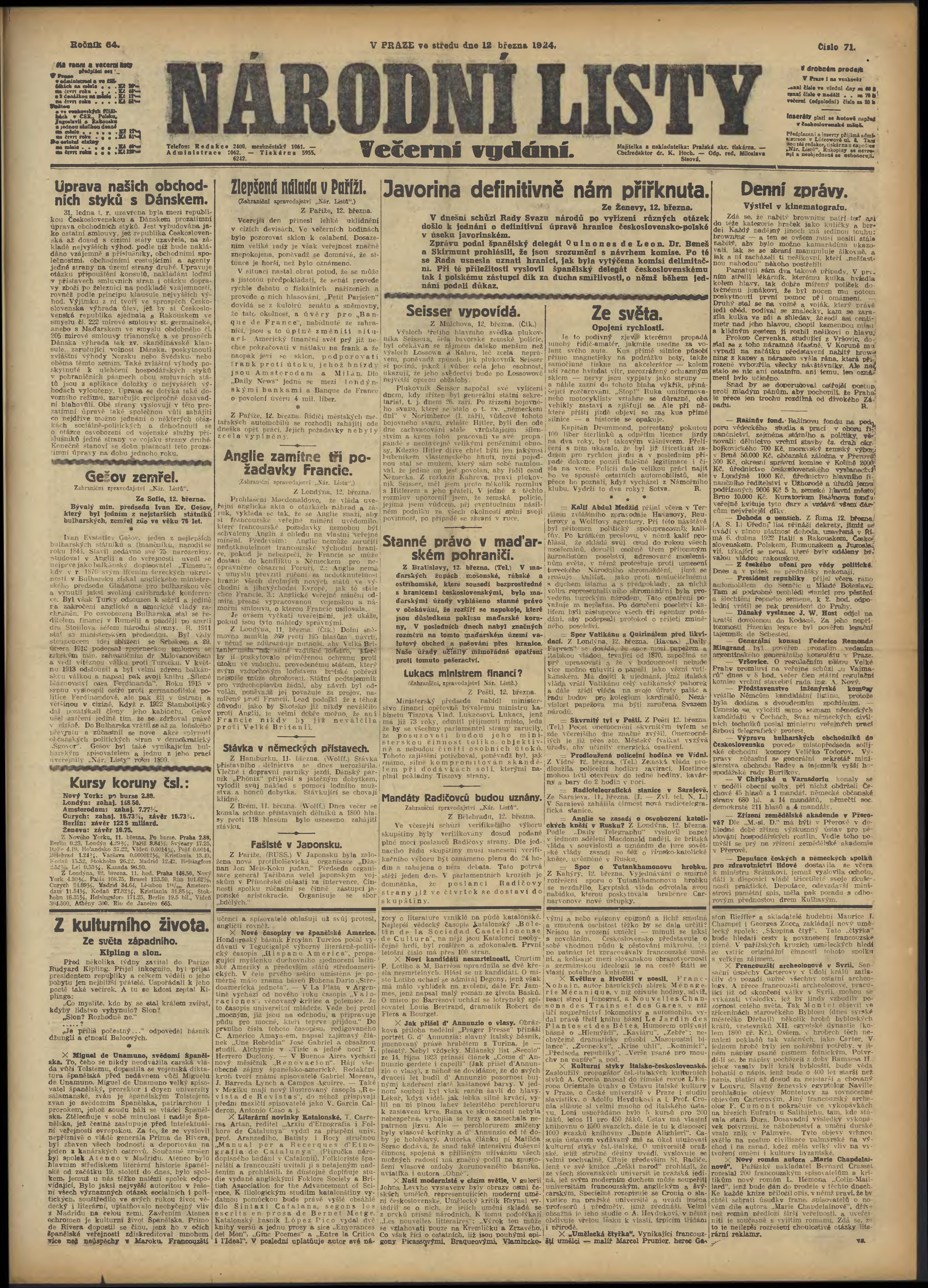 * Datum vydání výtisku: 12.3.1924 Číslo výtisku: 71 Poznámky k výtisku: večerní vydání;