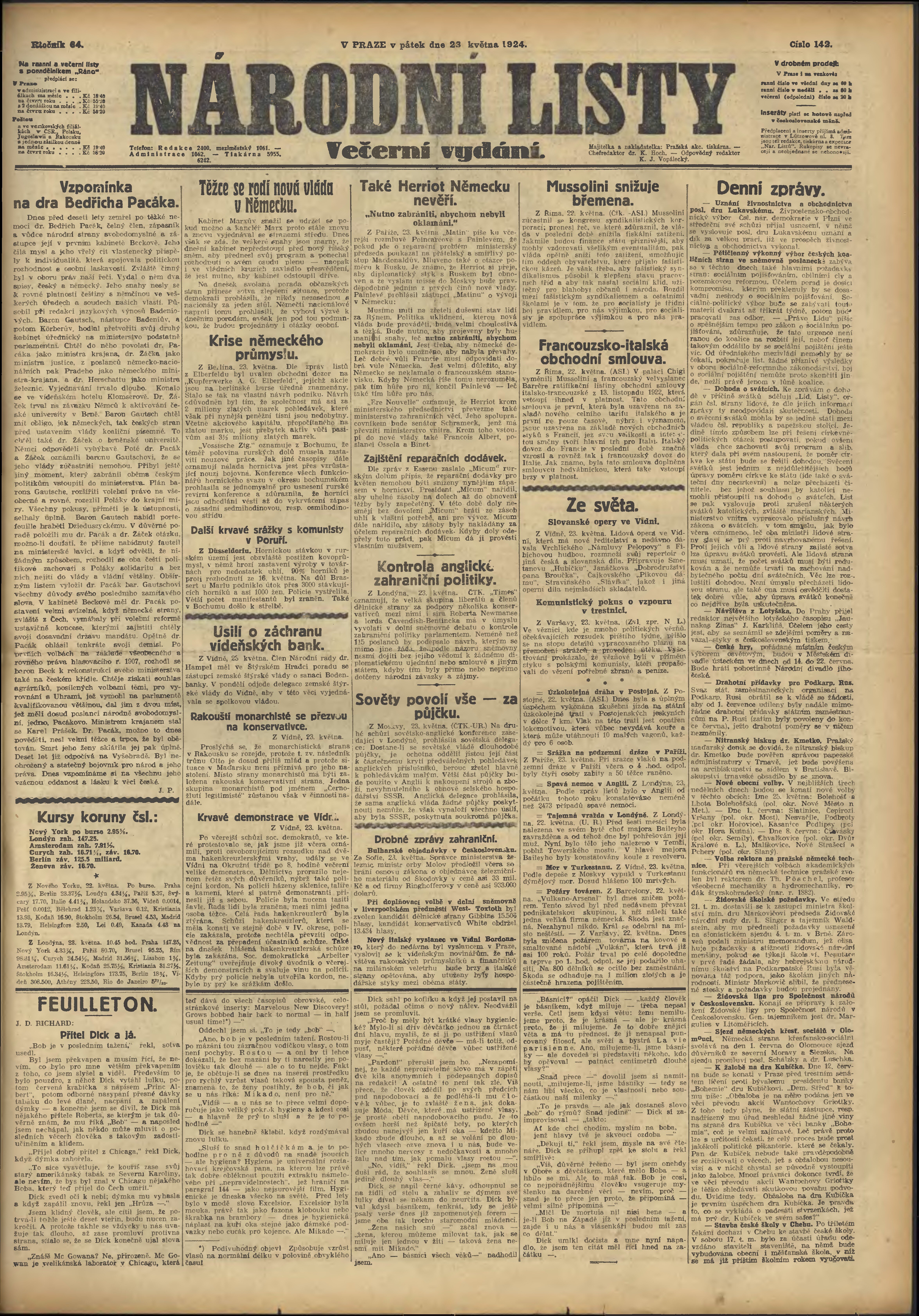 * Datum vydání výtisku: 23.5.1924 Číslo výtisku: 142 Poznámky k výtisku: večerní vydání;