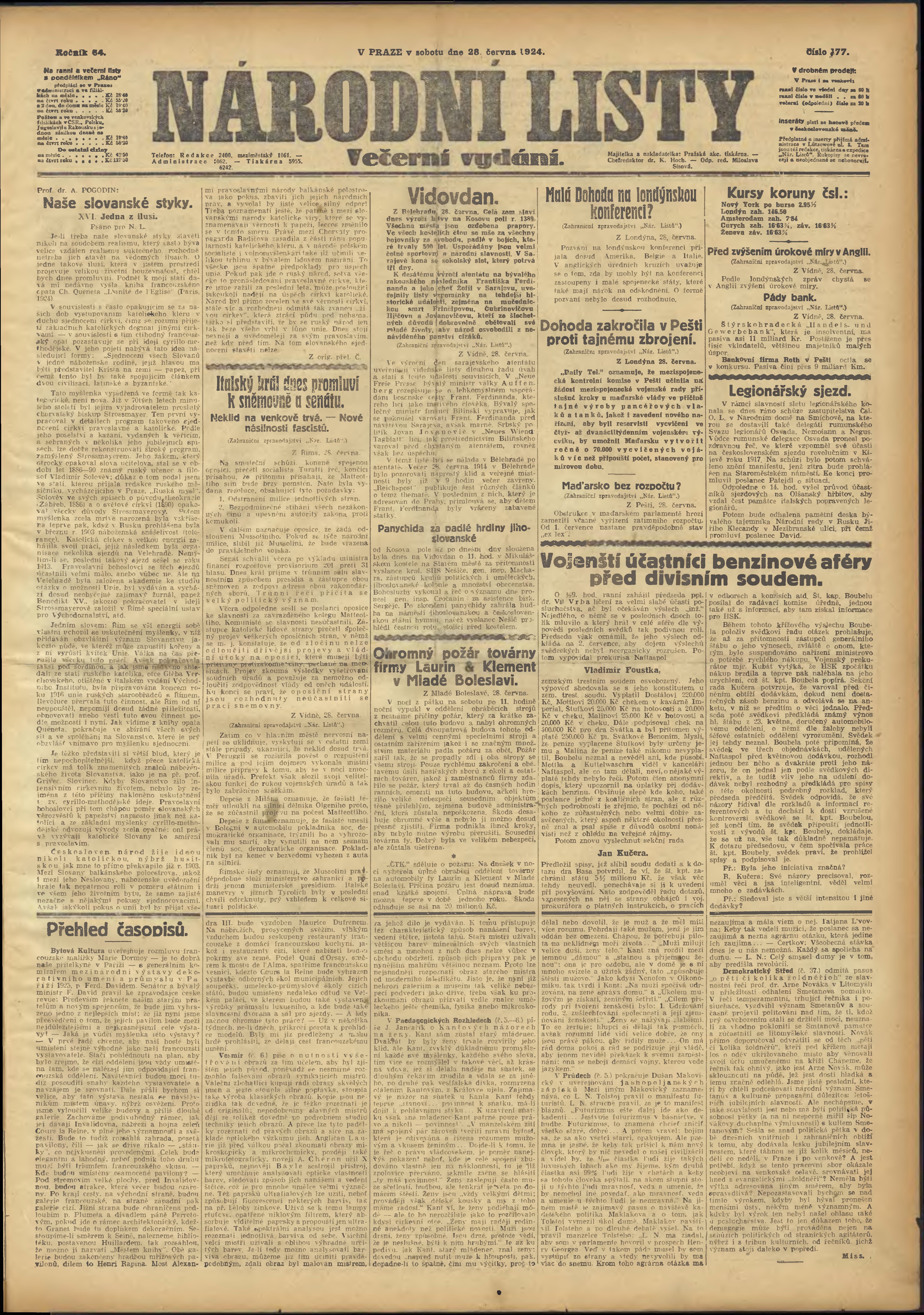* Datum vydání výtisku: 28.6.1924 Číslo výtisku: 177 Poznámky k výtisku: večerní vydání;