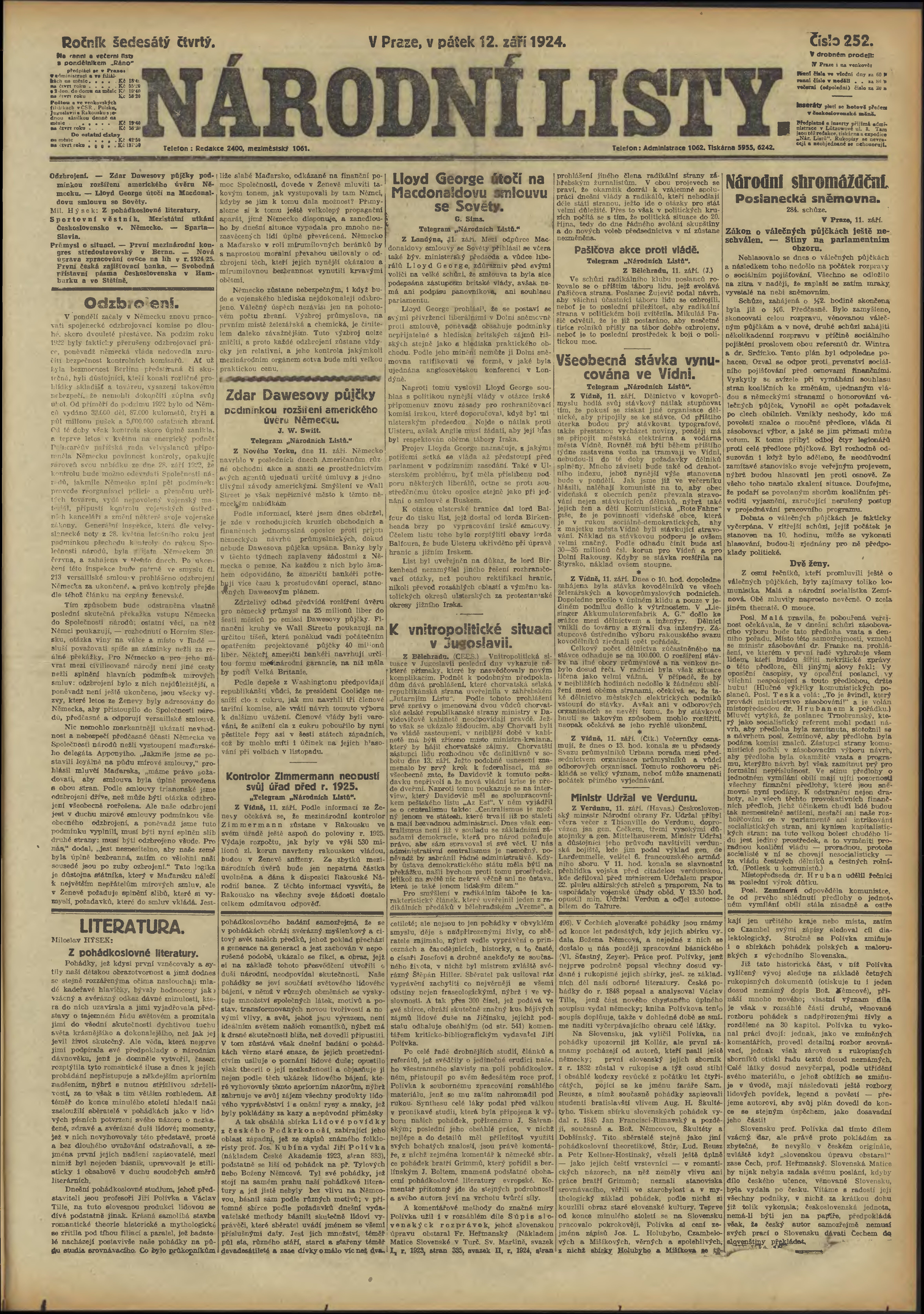 * Datum vydání výtisku: 12.9.1924 Číslo výtisku: 252