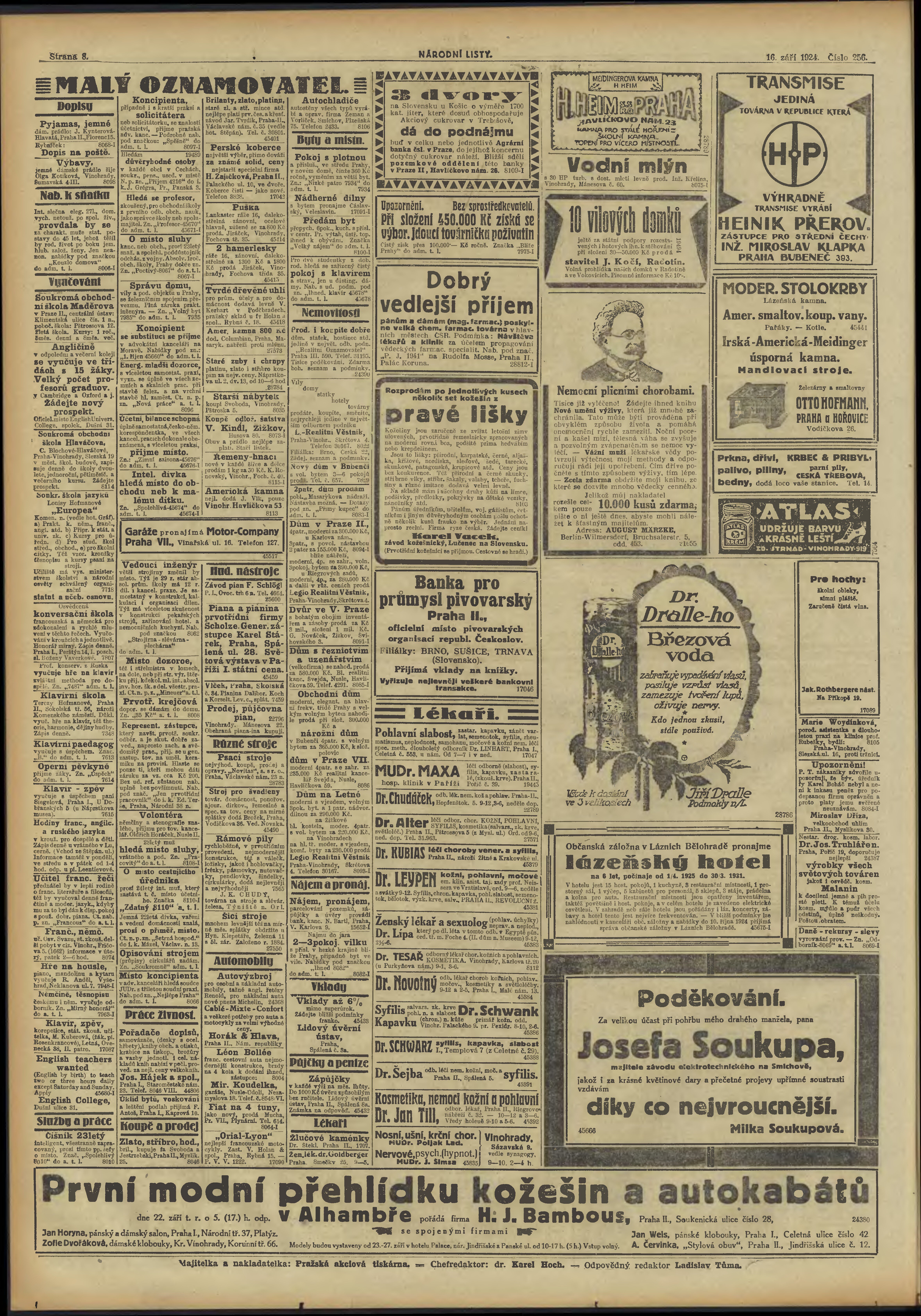 * Datum vydání výtisku: 16.9.1924 Číslo výtisku: 256