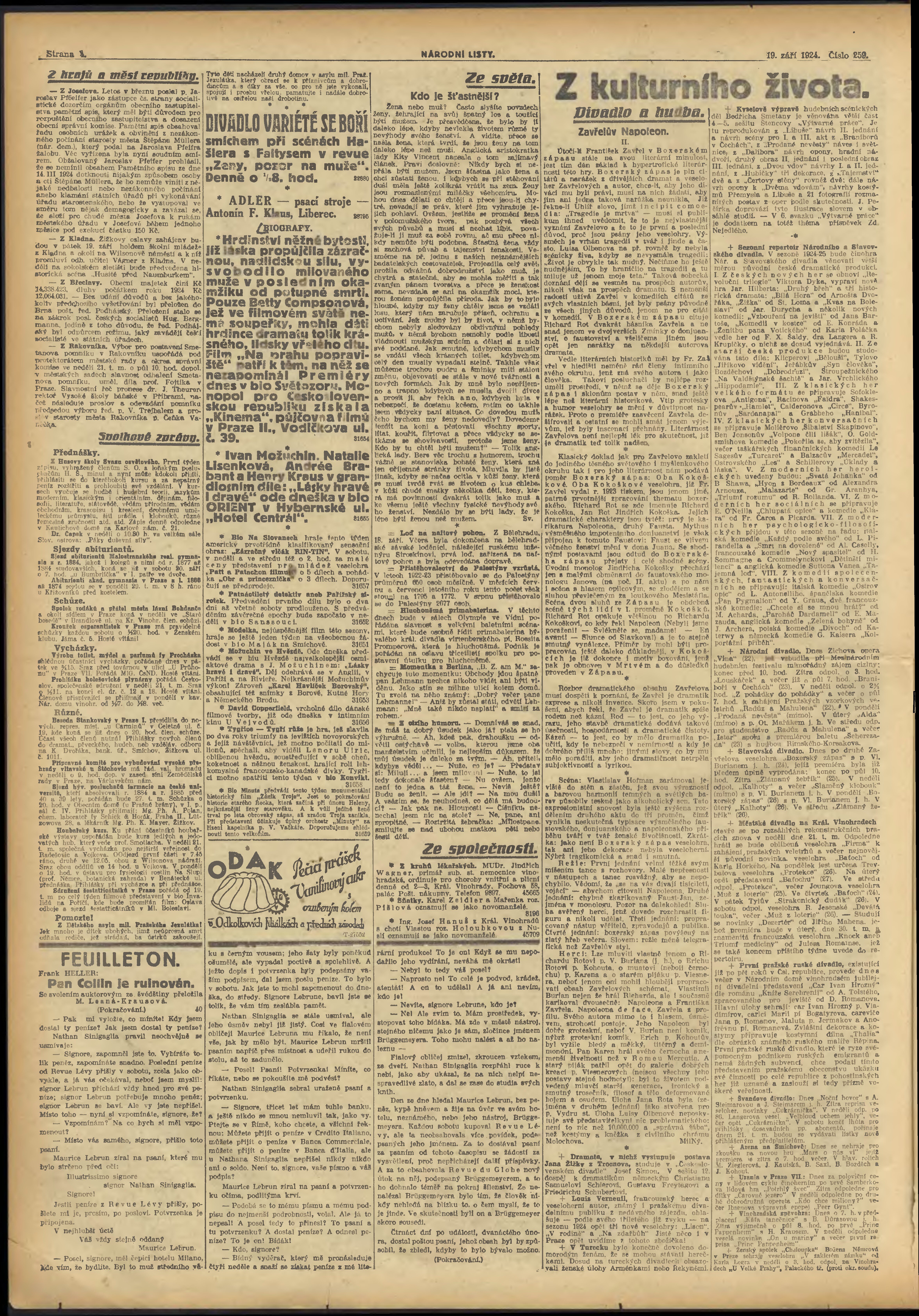 * Datum vydání výtisku: 19.9.1924 Číslo výtisku: 259 Poznámky k výtisku: s (1) - 2 poškozená předloha;