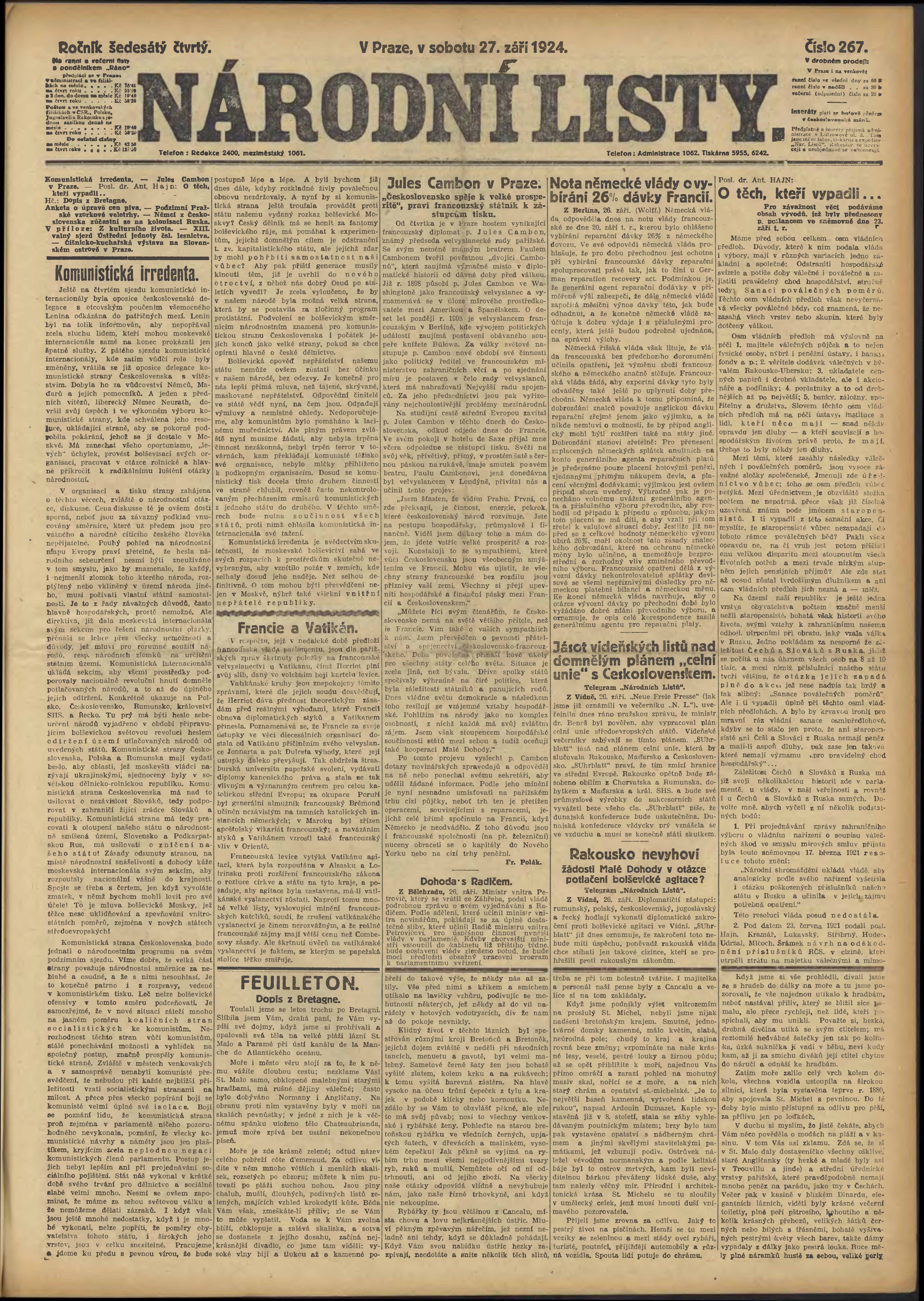 * Datum vydání výtisku: 27.9.1924 Číslo výtisku: 267