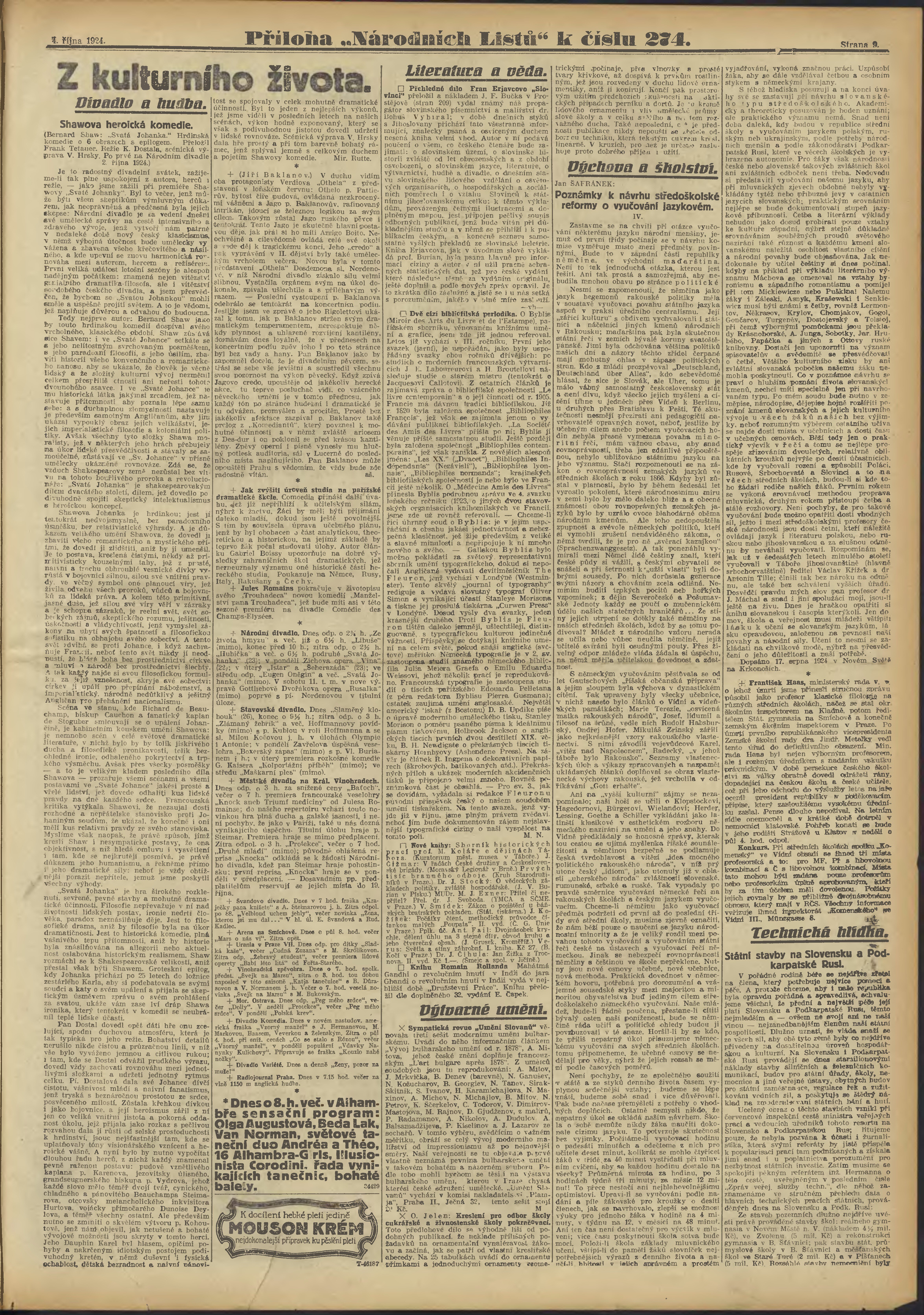 * Datum vydání výtisku: 4.10.1924 Číslo výtisku: 274 Typ výtisku: příloha